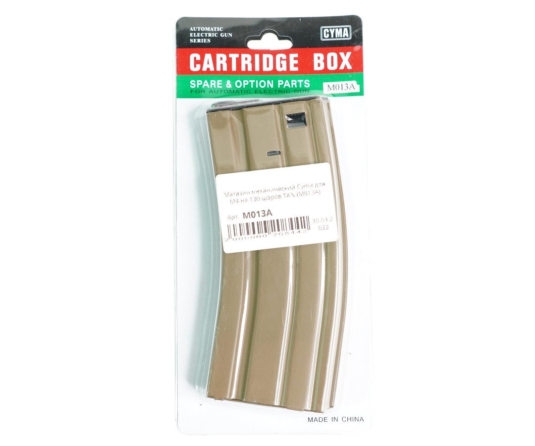 Магазин механический M013A от компании Cyma, Китай. Вместимость – 130 шаров. Магазин подходит для страйкбольных приводов серии M4. Корпус изготовлен из пластика песочного цвета.