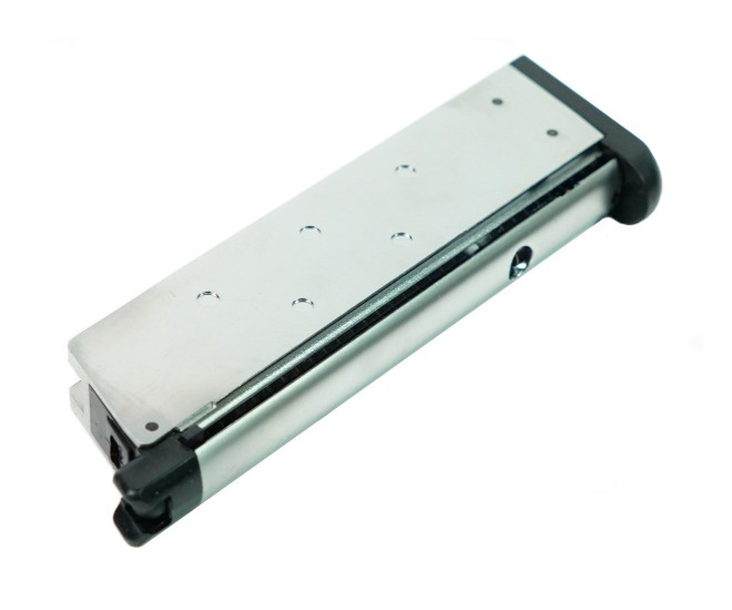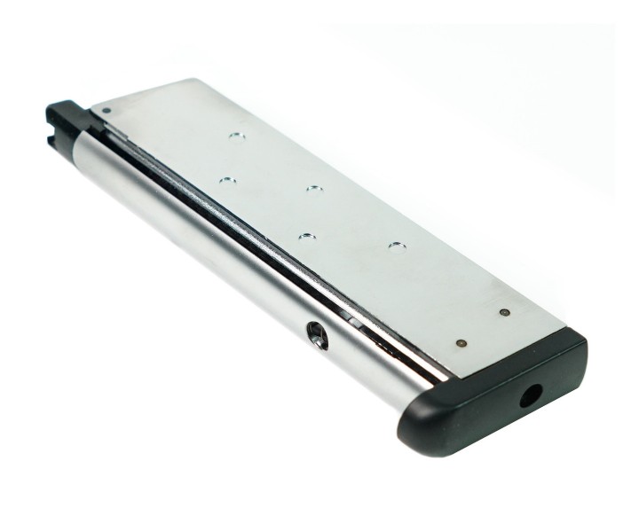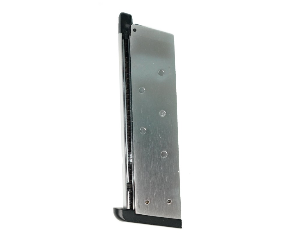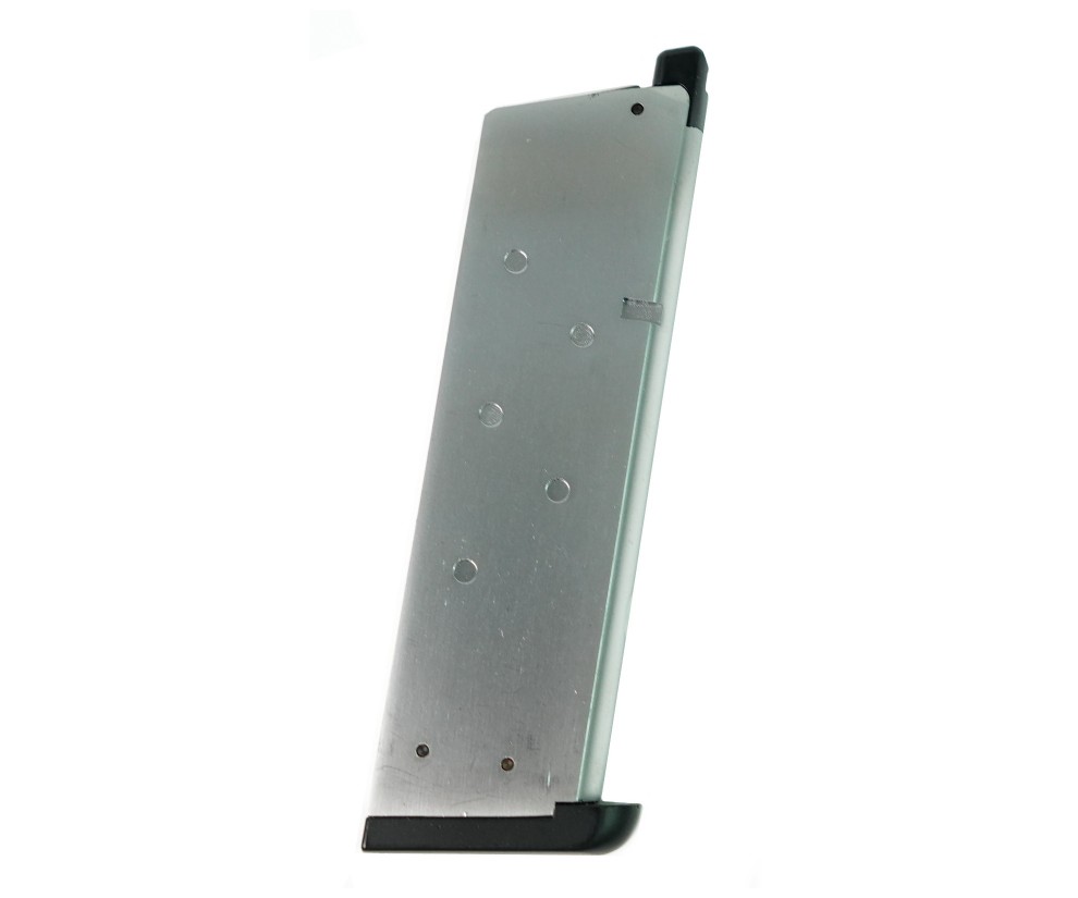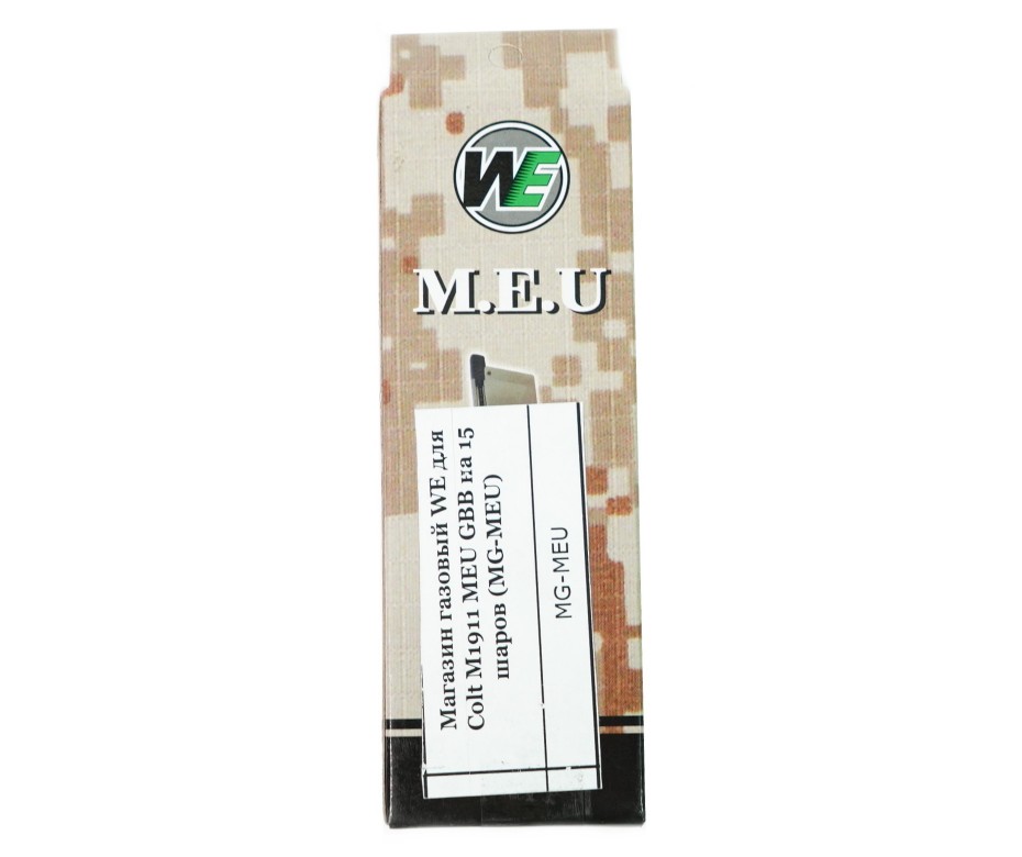 Запасной магазин для страйкбольного пистолета WE Colt M1911 M.E.U. (на грин-газе), вместимость составляет 15 шариков. Подходит также и для аналогичных моделей пистолетов фирмы KJW.