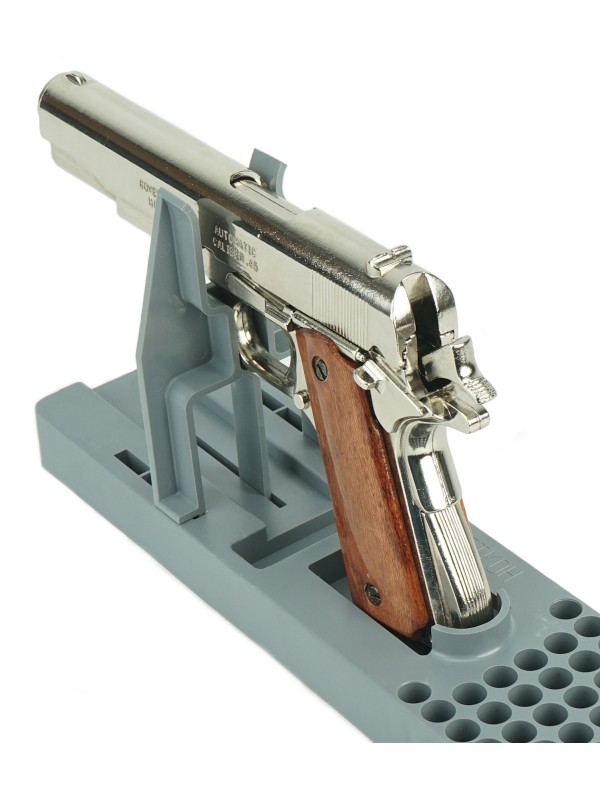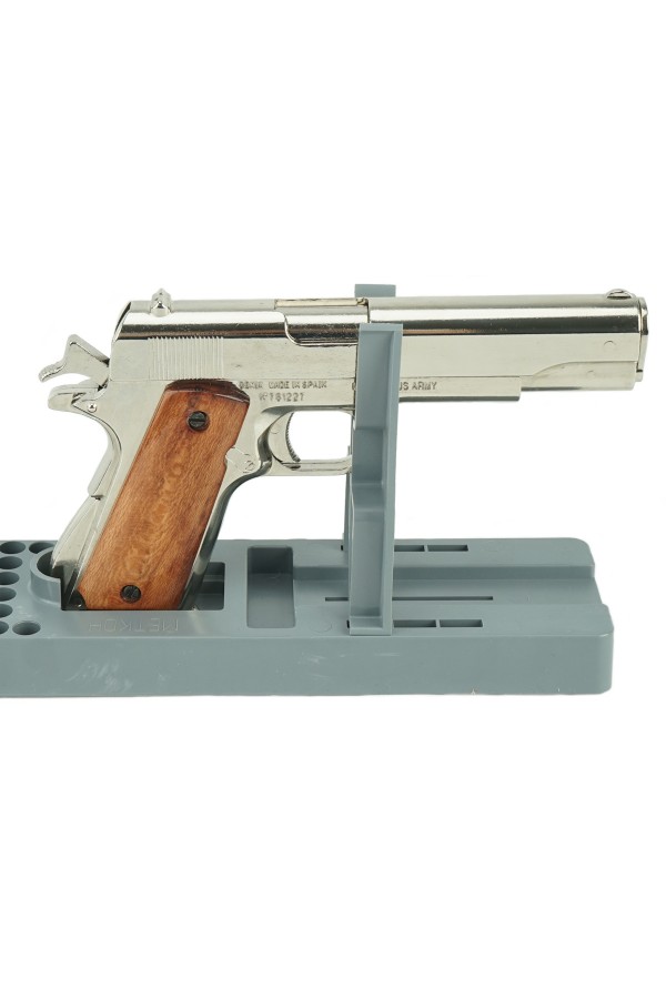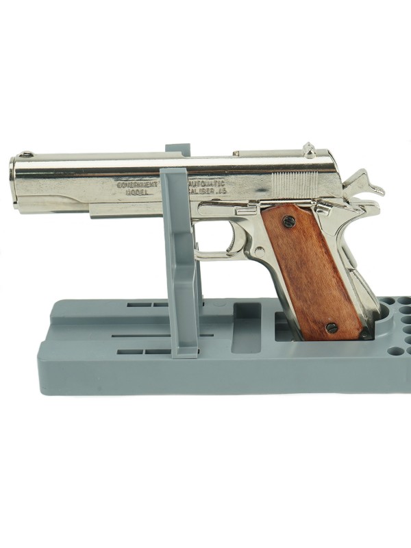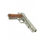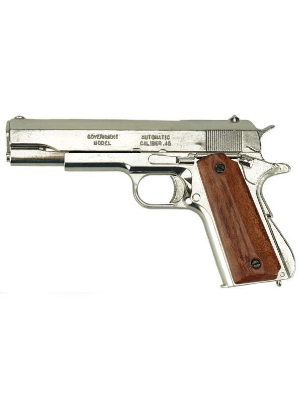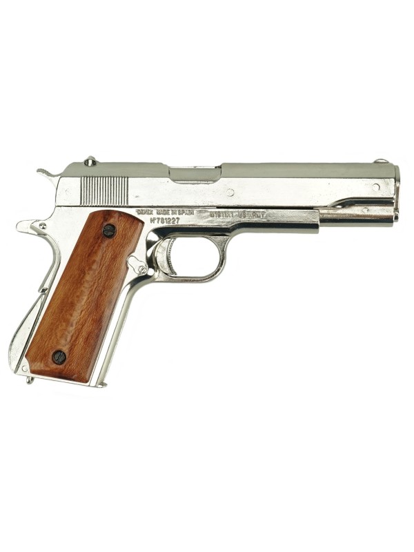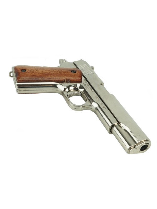 Реплика автоматического пистолета Кольт М1911, выполненная из хромированного металла и лакированного дерева. Имитация механизма заряжания и стрельбы.