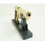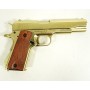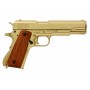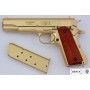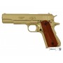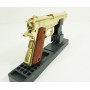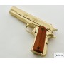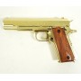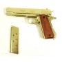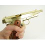 Реплика автоматического пистолета Кольт М1911, выполненная в золотистом цвете. Имитация механизма заряжания и стрельбы. Оснащен функциональными кнопками предохранителя, съемным стволом и съемным магазином.