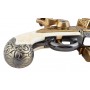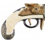 Макет изготовлен из высококачественного сплава на основе металла, что обеспечивает долговечность изделия. Изделие имеет великолепный внешний вид, очень эффектный и презентабельный. Дополнительный материал – полимер белого цвета, имитирующий натуральную слоновую кость, из него выполнены накладки на рукоятку. Пистолет украшен цветочным орнаментом с гравировкой. Длина изделия 33 см, вес 1 кг.