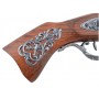 Изделие имеет красивый, очень эффектный внешний вид, украшено гравировками цветочной тематики. Изготовлен пистолет из металла и натурального дерева коричневого цвета. Вес мушкетона – 0,6 кг, длина 39 см.