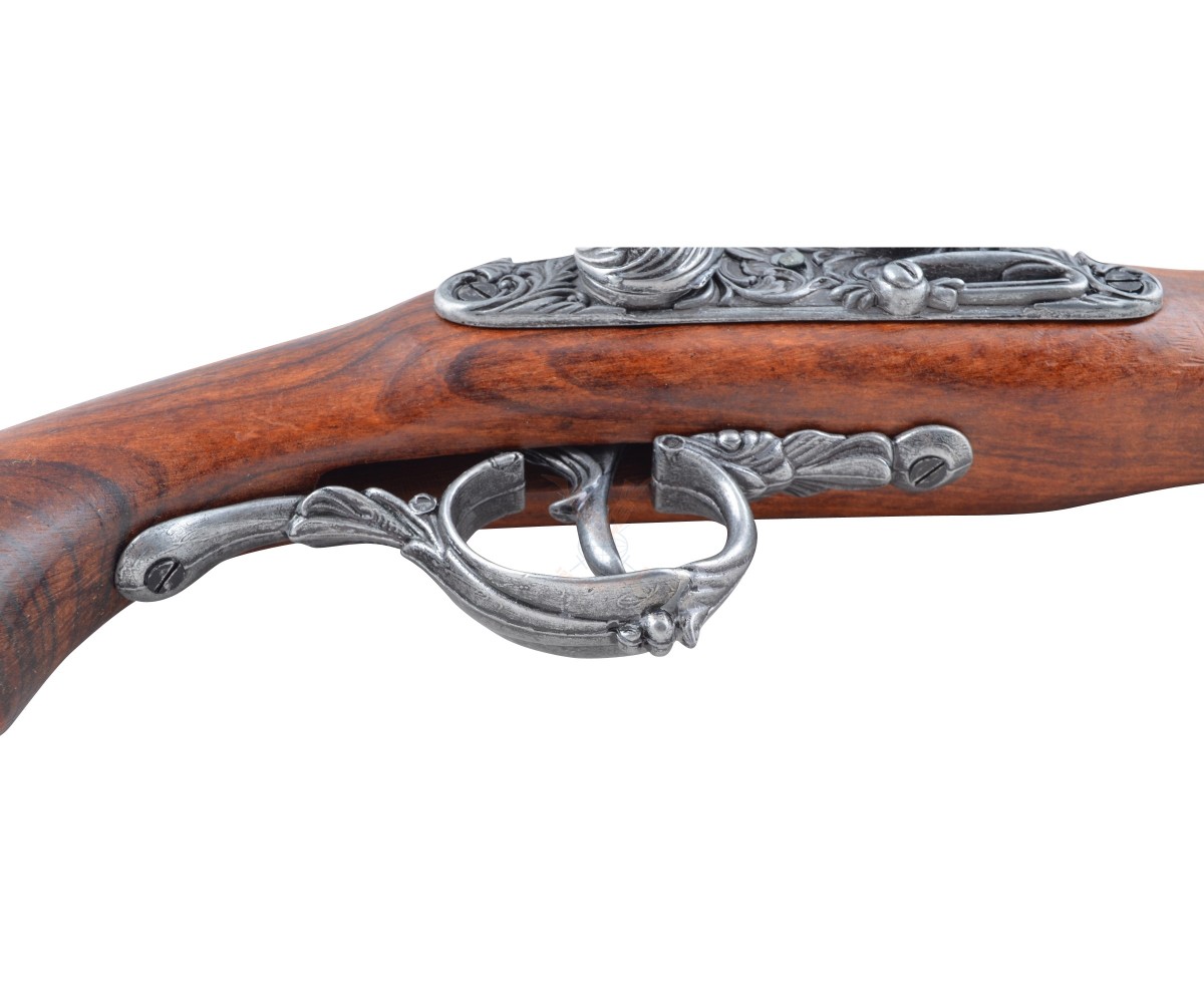 Макет пистолет кремневый, сталь (Германия, XVII век) DE-1260-G – это точная копия типичного исторического оружия 17 столетия, воспроизведенная брендом Деникс. Это изделие носит декоративно-сувенирный характер, и не может использоваться для стрельбы. Здесь подвижный ударно-спусковой механизм, который позволяет имитировать заряжание и нажатие на курок.