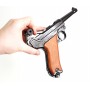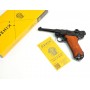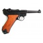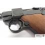 Макет пистолет Люгер Парабеллум P08 от испанской компании Denix отличается хорошим качеством исполнения и внешне максимально схожа на боевой прототип. Есть возможность передергивать затвор, спускать курок или вынуть обойму. Размеры, конфигурация и вес макета соответствуют оригиналу. Для производства этого экземпляра использован качественный сплав на основе цинка и дерево для рукоятки.