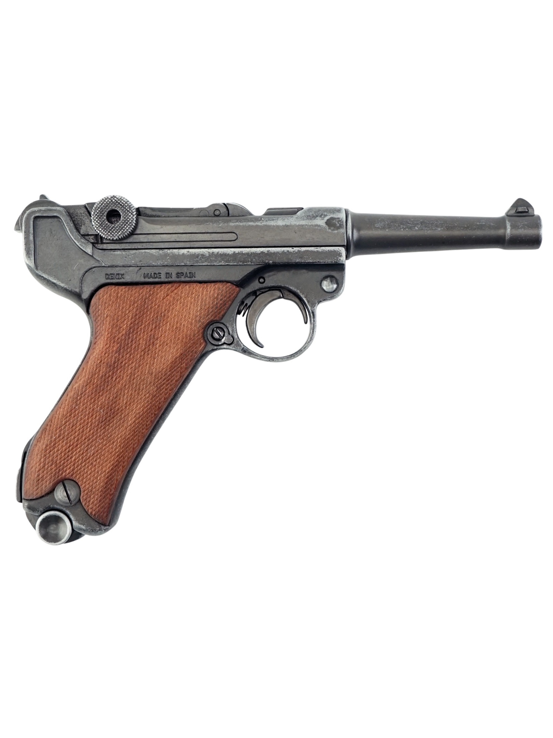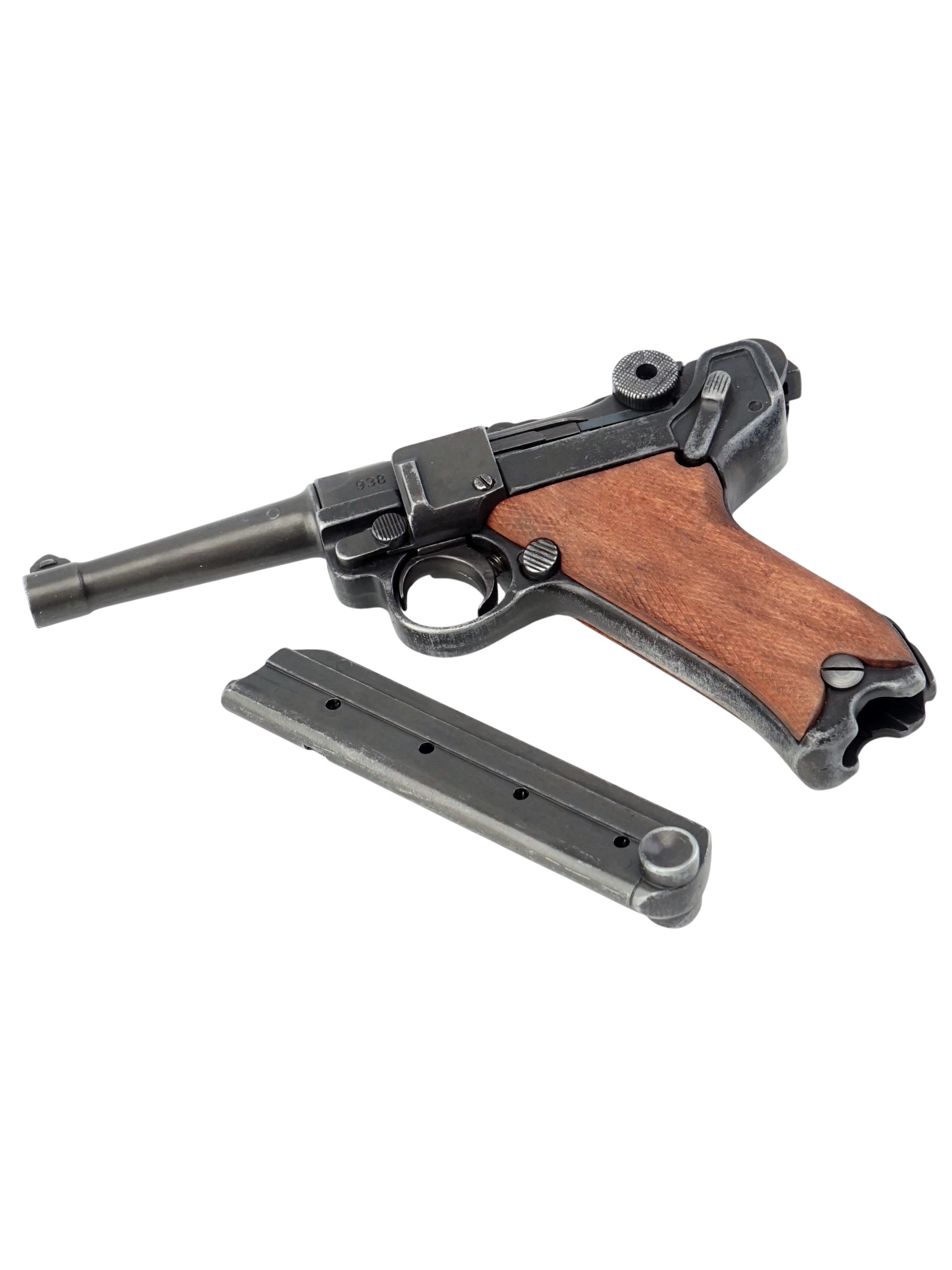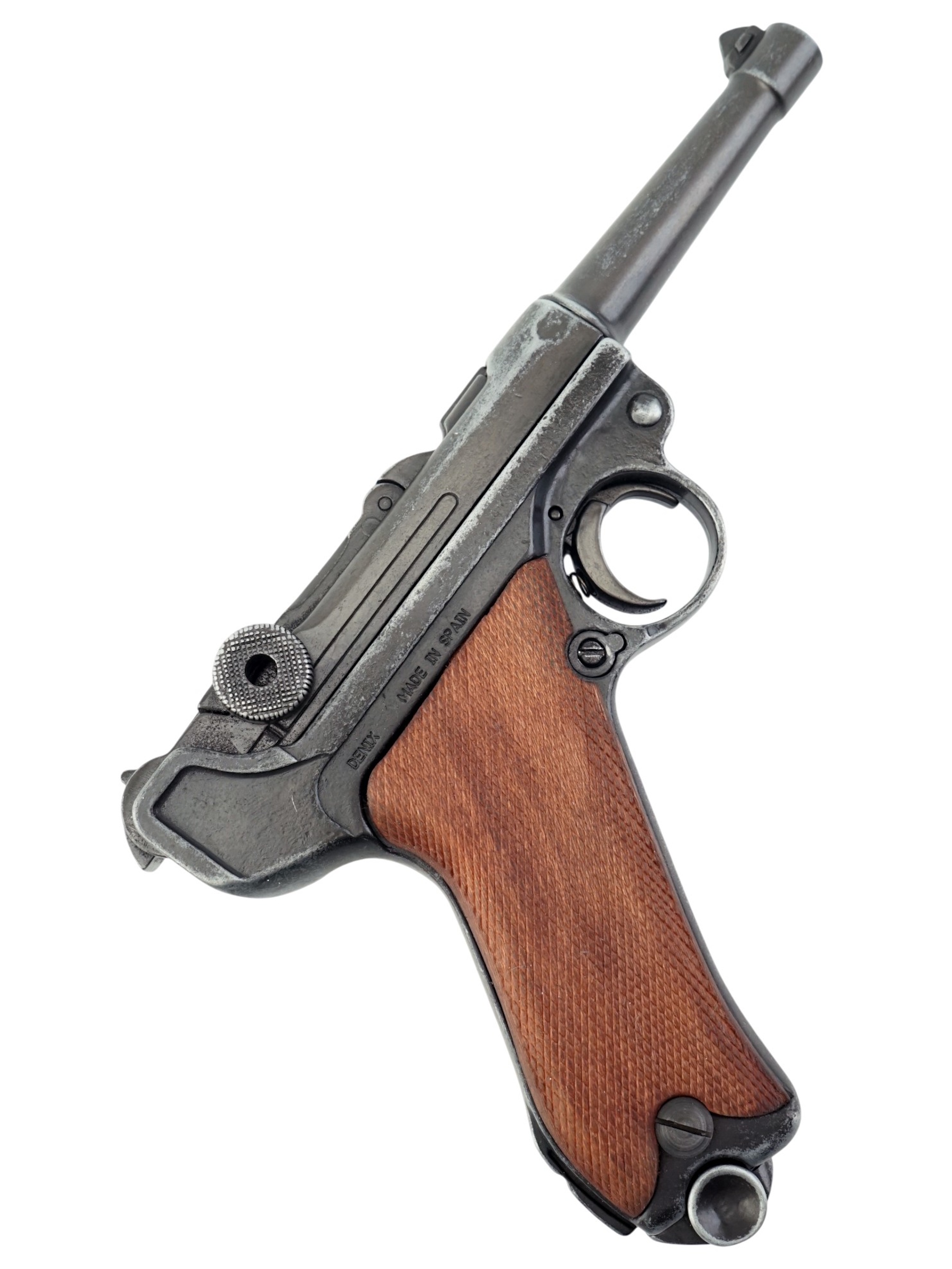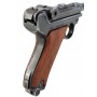 Макет пистолет Люгер Парабеллум P08 от испанской компании Denix отличается хорошим качеством исполнения и внешне максимально схожа на боевой прототип. Есть возможность передергивать затвор, спускать курок или вынуть обойму. Размеры, конфигурация и вес макета соответствуют оригиналу. Для производства этого экземпляра использован качественный сплав на основе цинка и дерево для рукоятки.