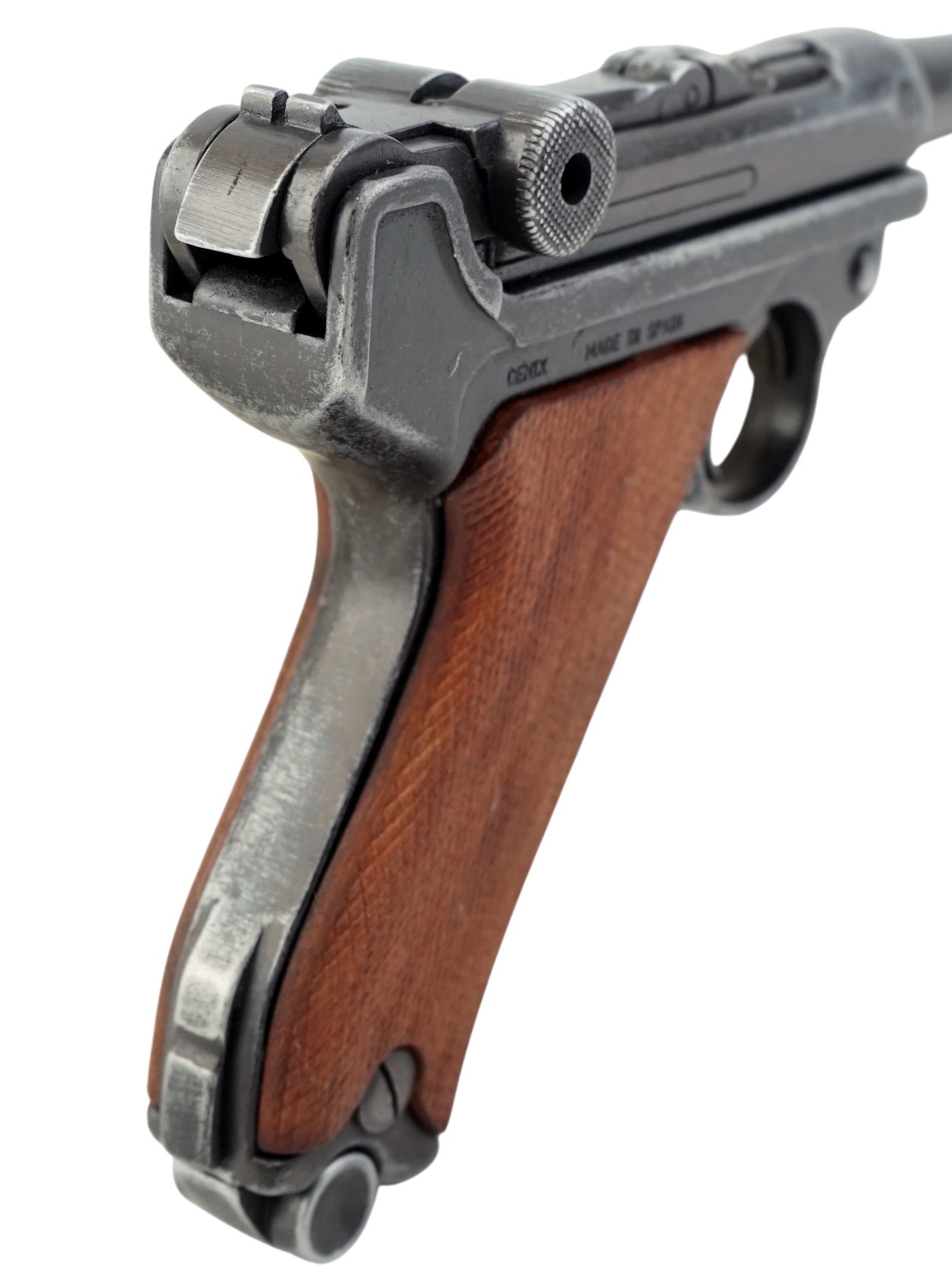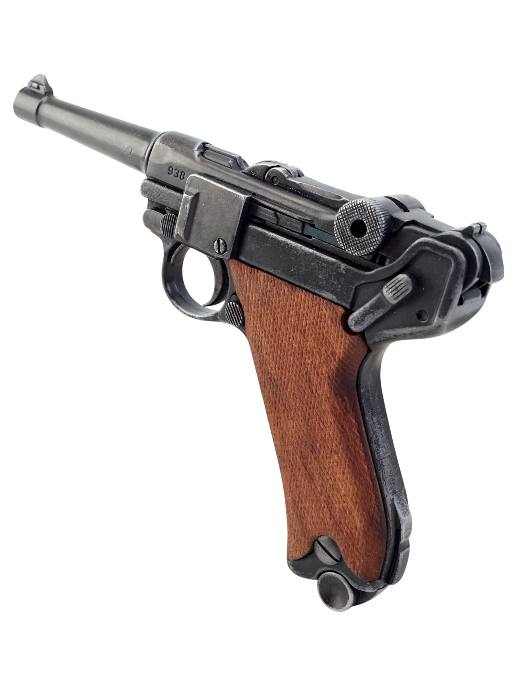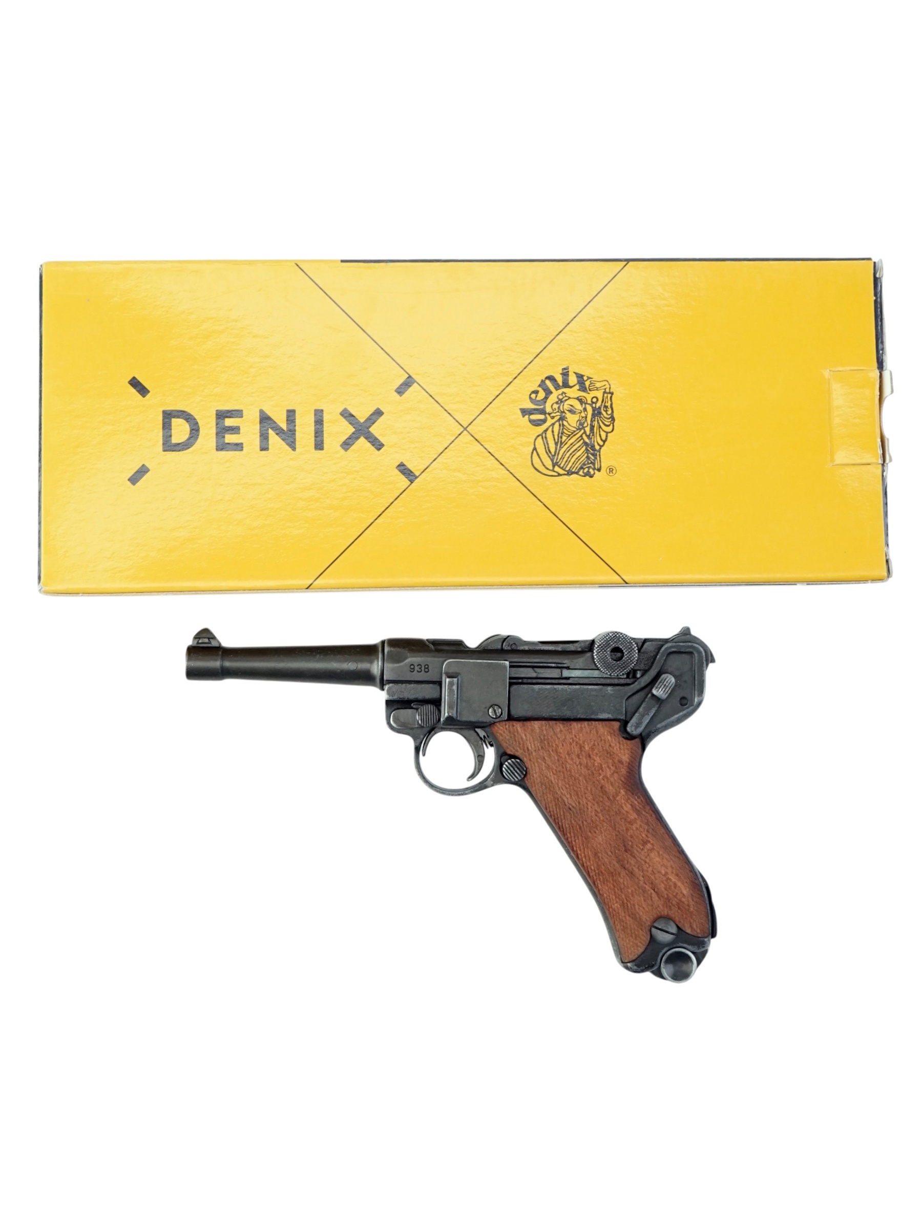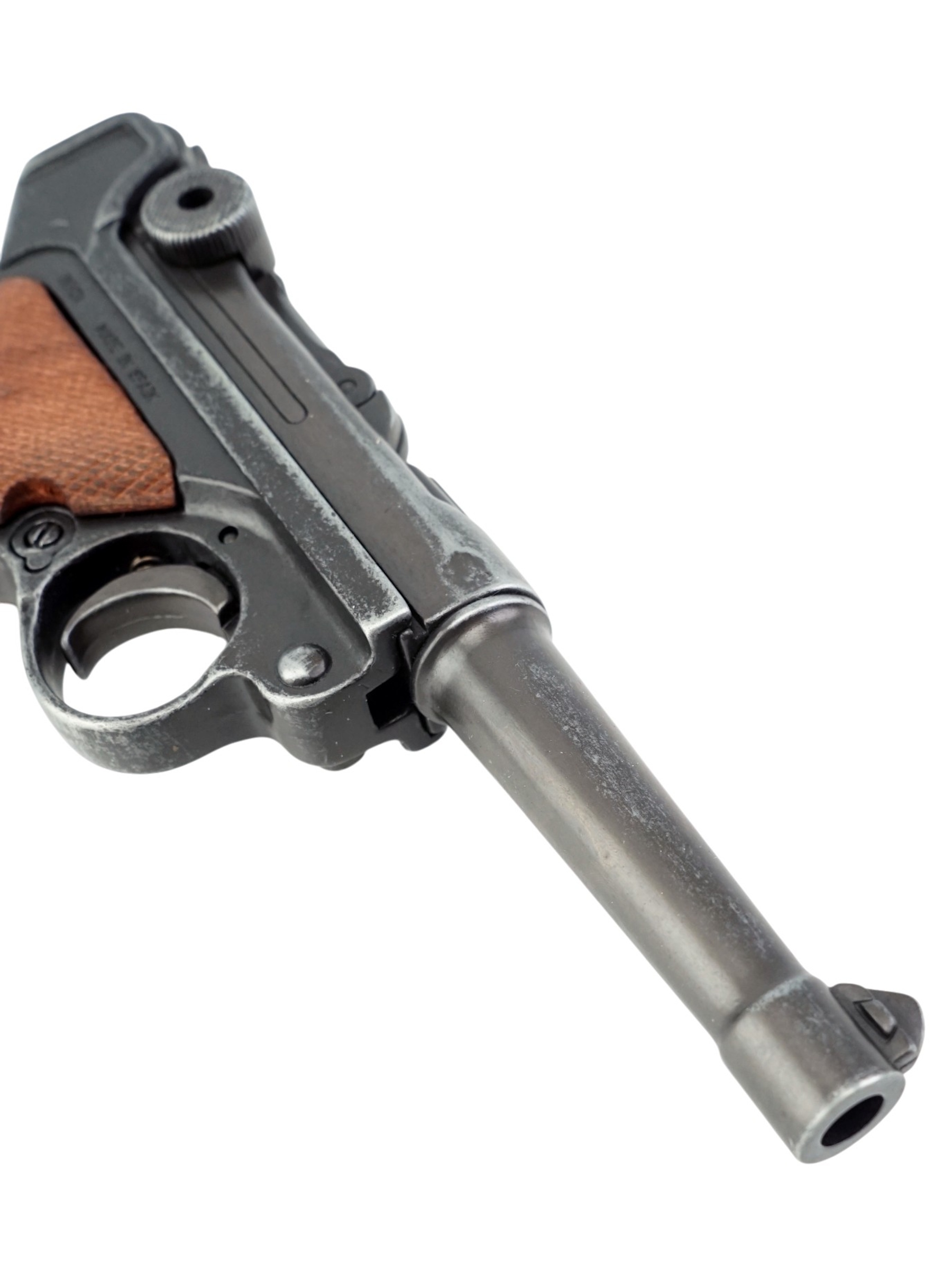 Макет пистолет Люгер Парабеллум P08 от испанской компании Denix отличается хорошим качеством исполнения и внешне максимально схожа на боевой прототип. Есть возможность передергивать затвор, спускать курок или вынуть обойму. Размеры, конфигурация и вес макета соответствуют оригиналу. Для производства этого экземпляра использован качественный сплав на основе цинка и дерево для рукоятки.
