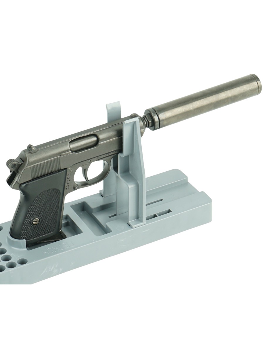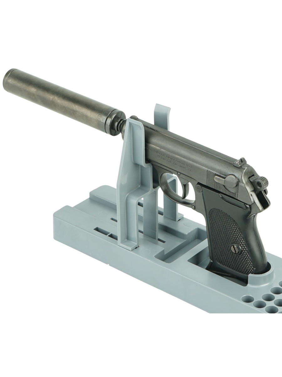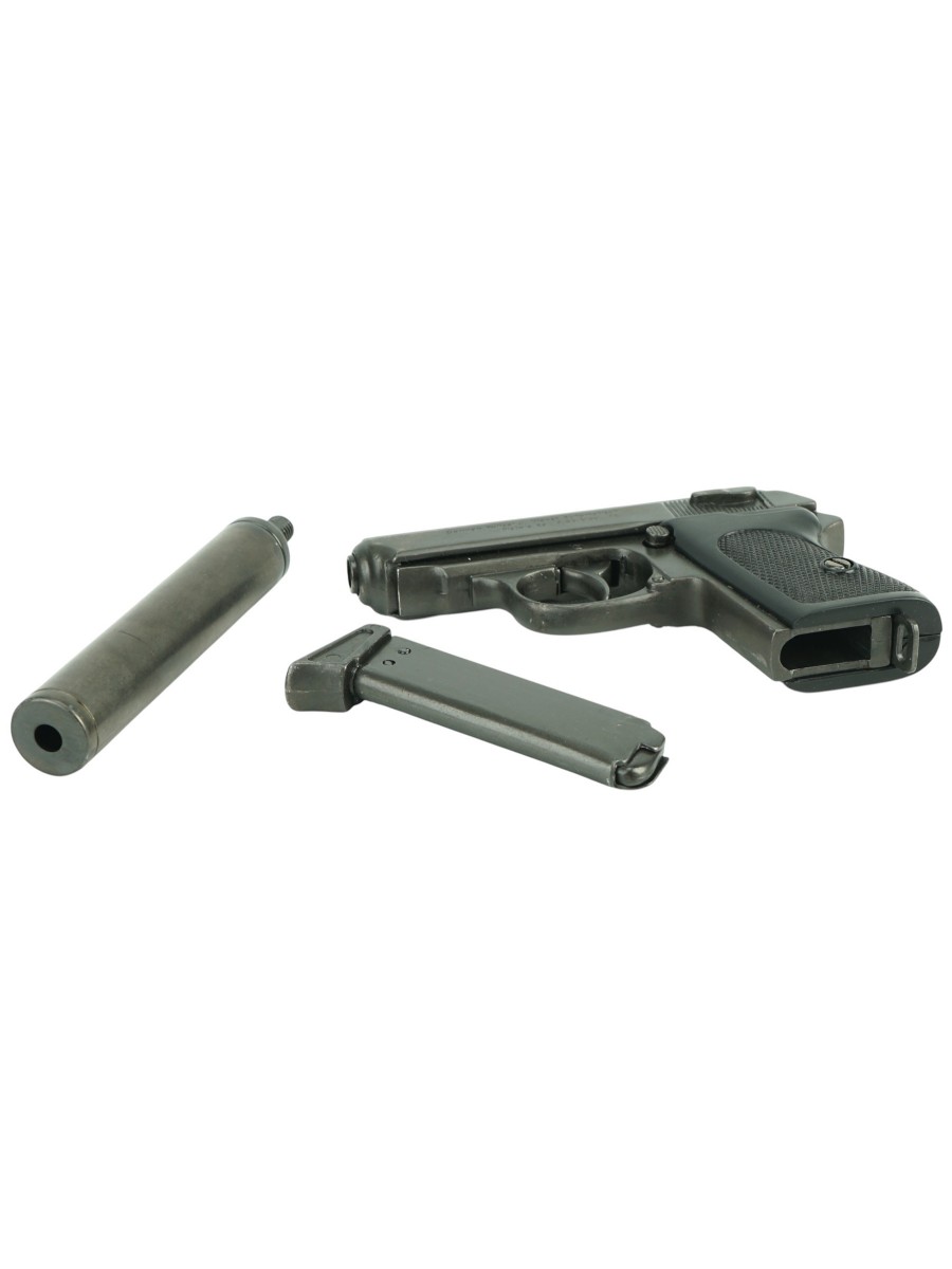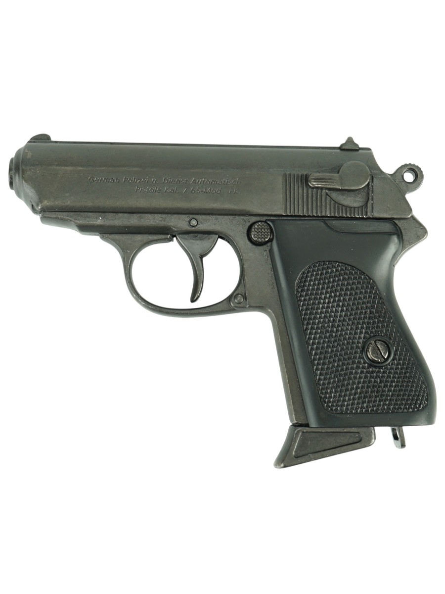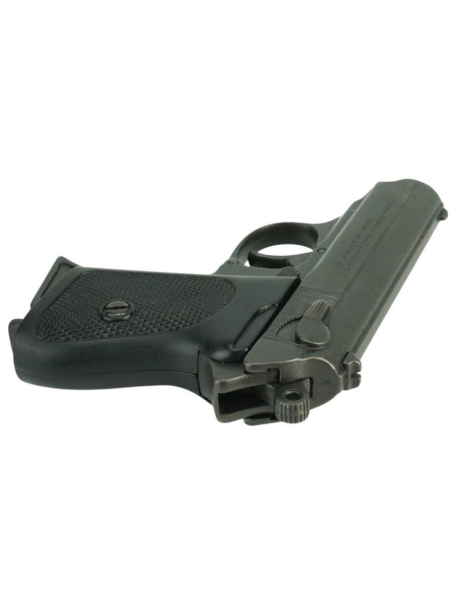 Макет пистолет Вальтер PPK с глушителем (Германия, 1931 г.) DE-1311 – это копия немецкого оружия, патент на его производство после поражения Германии во Второй мировой купили несколько стран-союзников. Данная модель отличается наличием глушителя, что практически вдвое увеличивает ее длину. Вальтер РРК без глушителя отличался небольшими размерами, и считался отличной моделью для скрытого ношения. Кстати, Бонд в исполнении Шона Коннери не раз был замечен именно с таким Вальтером.