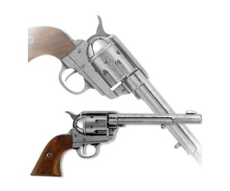 Макет Кольт кавалерийский – это выполненная в отличном качестве и полном масштабе модель легендарного оружия Дикого Запада, который остается популярным и в наше время. Кольт кавалерийский 45 калибра. Автором разработки считается Чарльз Ричардс, оружие было разработано по заказу правительства США, и производилось, начиная с 1873 года. Официальное название револьвера – Colt M1873 Single Action Army. В народе больше прижилось другое наименование этого оружия – Миротворец. Кольт 45 калибра использовался артиллерийскими и кавалерийскими войсками, постепенно длина ствола уменьшалась. Выпускались и Кольты меньшего калибра, рассчитанные на использование гражданским населением. Кольт кавалерийский производился до 1940 года, к этому времени было выпущено почти 360.000 единиц. С некоторыми перерывами производство кольта M1873 Single Action Army продолжается и сегодня.