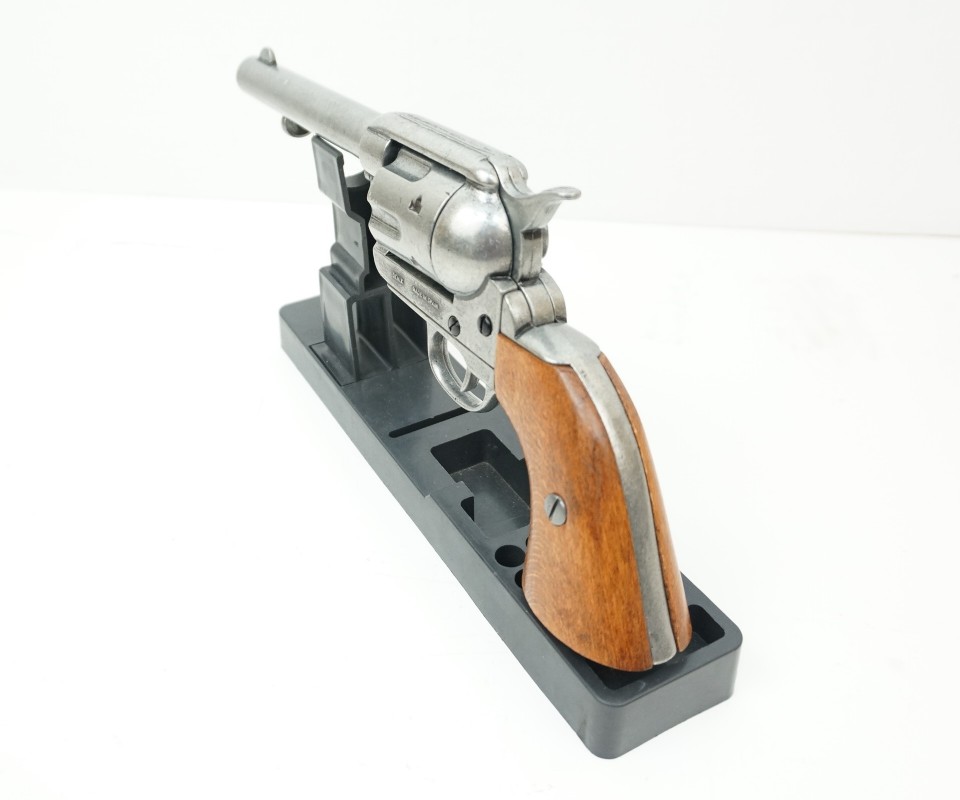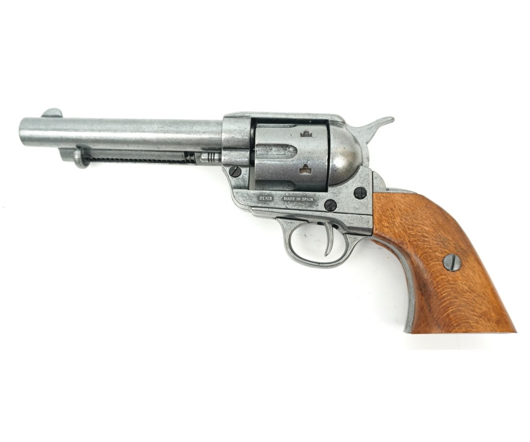 Макет револьвер Кольт Peacemaker, .45 калибра, 5½", 6 патронов (США, 1873 г.) DE-1-1106-G – это декоративная версия прославленного не только на Диком западе Кольта Писмейкер. Изделие полностью копирует знаменитый боевой прототип, при этом не предназначено для ведения стрельбы и использования каких-либо боеприпасов. Кольт Миротворец в разное время выпускался с различной длиной ствола и под разные калибры.