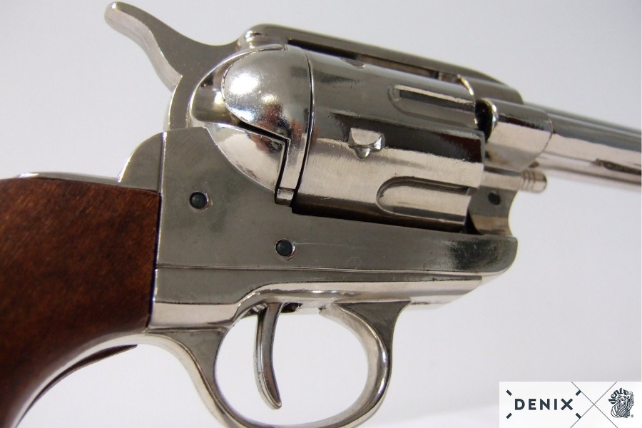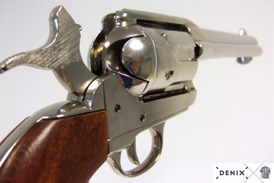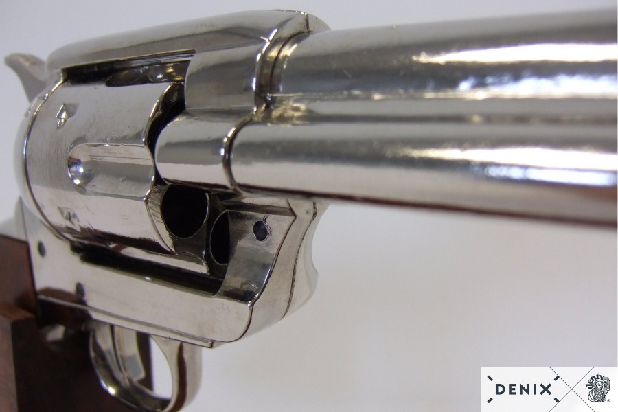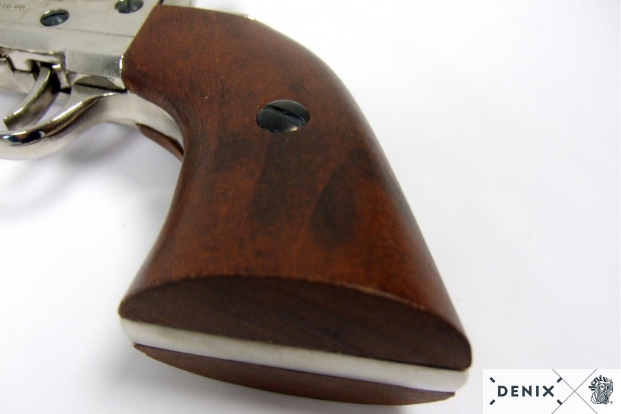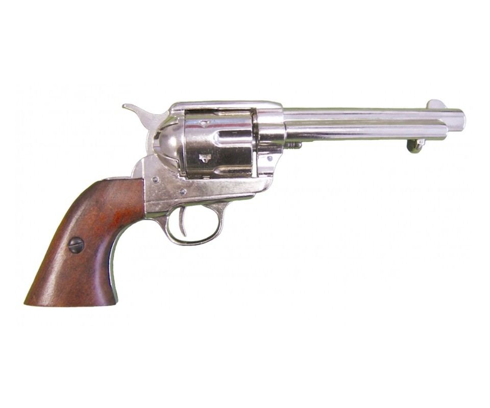 Реплика револьвера Colt с длиной ствола 5,5 дюймов, изготовленный из металла с деревянными накладками на рукоять. Имитация механизма заряжания и стрельбы, вращения барабана.