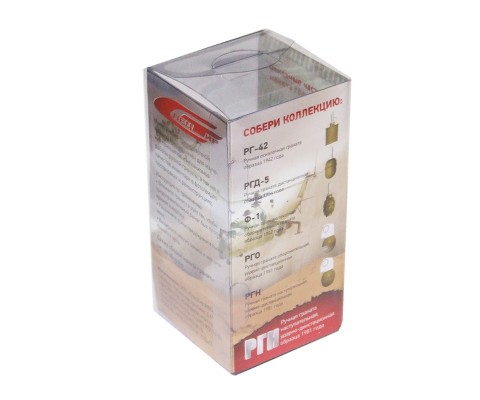Макет гранаты РГО представляет собой массогабаритную реплику боевого боеприпаса, корпус которой изготовлен из металлического сплава, а верхняя часть пластиковая. Аналогично оригиналу, нижняя полусфера окрашена в оливковый цвет, верхняя – в белый. Запал и чека доступны для извлечения. Имитатором запала УЗРГ данный макет не комплектуется. Вес макета составляет 0,53 кг, габаритные размеры аналогичны боевому прототипу – 113х60х60 мм.