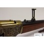 Макет винтовка Винчестер, изготовленная мастерами испанского бренда Denix, выглядит невероятно эффектно и грозно. Практически невозможно определить, что перед вами – сувенирная копия легендарной винтовки – все элементы выполнены соответственно оригинальному образцу, вес и длина макета также отвечают прототипу. В производстве этого экземпляра использован металлический сплав, латунь (для ствольной коробки) и натуральное дерево (для ложа и приклада). По латуни выполнена гравировка с изображением охотника с ружьем, в окружении красивого цветочного узора. Вес винтовки составляет 2,65 кг, ее длина – 99 см. Действующий ударно-спусковой механизм позволяет выполнить взведение и нажать на курок.