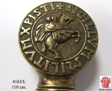Макет меч рыцаря Тамплиера от компании Denix представляет собой изготовленную вручную великолепную реплику грозного оружия храмовника. Изделие изготовлено из цинкового сплава zamak, отлично подходящего для макетов оружия. Масса меча соответствует средним весовым параметрам такого оружия, и составляет 2,37 кг, его длина – 110 см. Рукоять меча имеет поверхность с округлыми ребрами, эфес слегка закругленной формы, с изображением креста и другой символики ордена. Навершие круглое, в центре его изображено два рыцаря на коне, по краю идет надпись на латыни «печать воина Христа». Клинок меча с долом по всей его длине. Клинок оружия не заточен и в принципе не подлежит заточке, так что такой экземпляр не будет представлять опасности. Ножны металлические, красного цвета, сверху обтянуты кожей и украшены декоративными элементами.