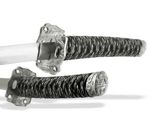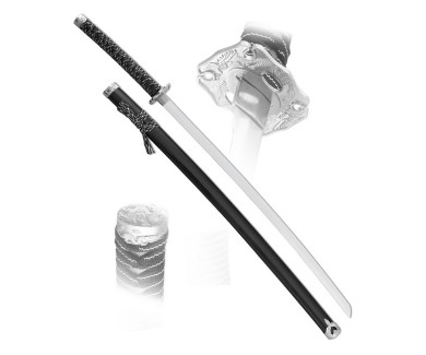 Классическая Катана с черными ножнами и оригинальной цубой с японскими мотивами (драконы) по доступной цене. Рукоять прошита черно белыми нитками. Отлично подходит для оформления дизайна и интерьера в японском стиле. Настольная подставка в комплекте.