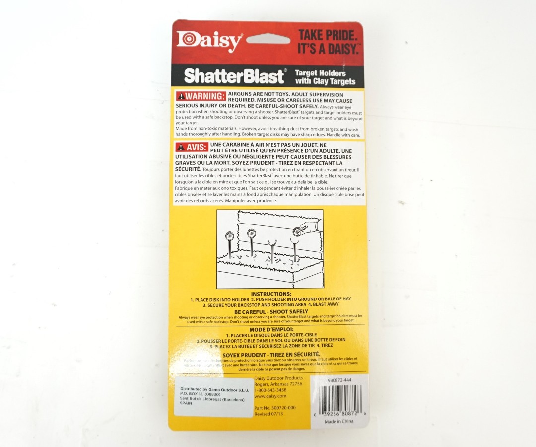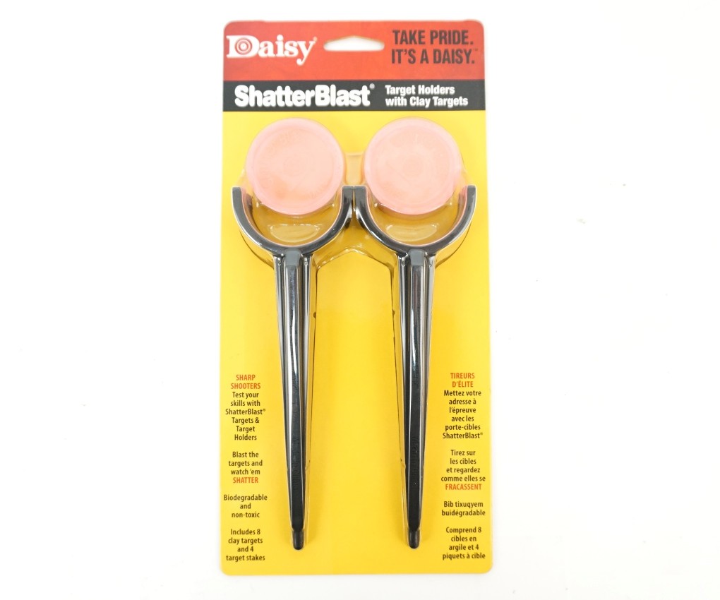 Мишени ShatterBlast имеют 2 дюйма (51 мм) в диаметре и 1/8 дюйма (3 мм) толщиной; разрушаются после попадания в цель. Комплект включает в себя 4 ударопрочные подставки, которые нужно воткнуть в землю и 8 целевых мишеней.