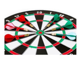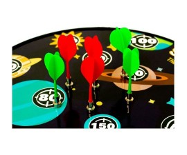 Для самых маленьких пригодятся безопасные магнитные дротики и специальная доска "Космос" для них: они не содержат колющих частей и рекомендованы для детей. Вторая сторона доски подойдёт всем, кто учится игре в дартс и коротает за ней свободное время: классическая доска из прессованной бумаги толщиной 13 мм. Диаметр 38,1 см. Также, в комплекте 6 классических дротиков и 6 магнитных дротиков. Настенное крепление поможет разместить мишень в удобном месте.