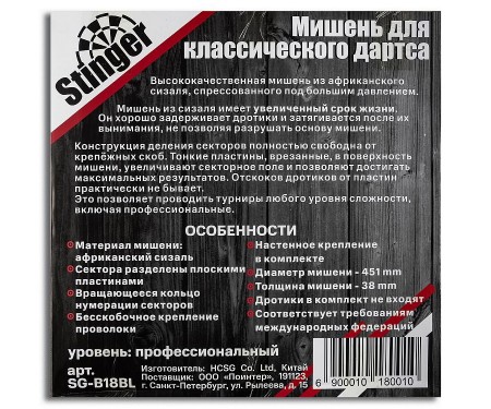 Конструкция деления секторов полностью свободна от крепежных скоб. Тонкие пластины, врезанные в поверхность мишени, увеличивают секторное поле и позволяют достигать максимальных результатов Отскоков дротиков от пластин практически не бывает. Это позволяет проводить турниры любого уровня сложности, включая профессиональные.