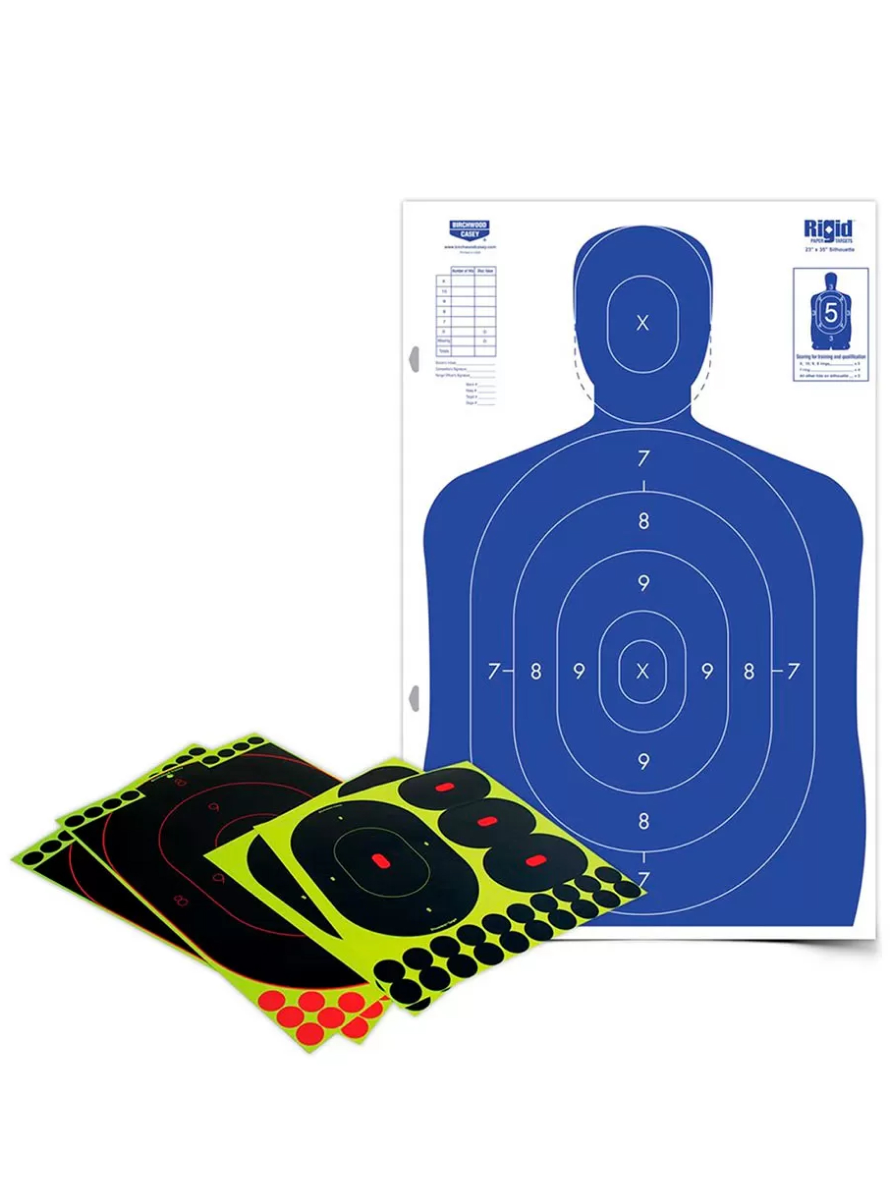 Набор из мишеней Shoot•N•C Silhouette Kit 12x18" состоит из одной картонной мишени в виде силуэта человека, а также из набора осыпающихся мишеней и заклеек для них.
