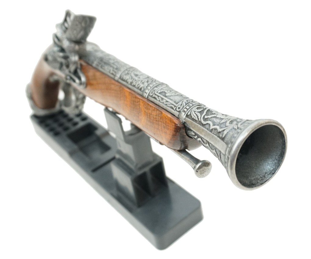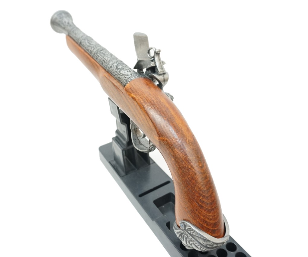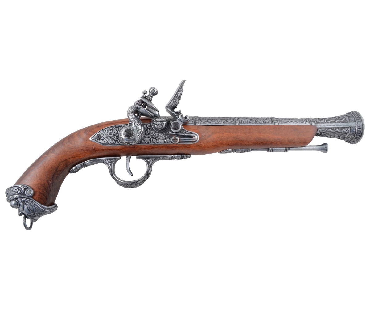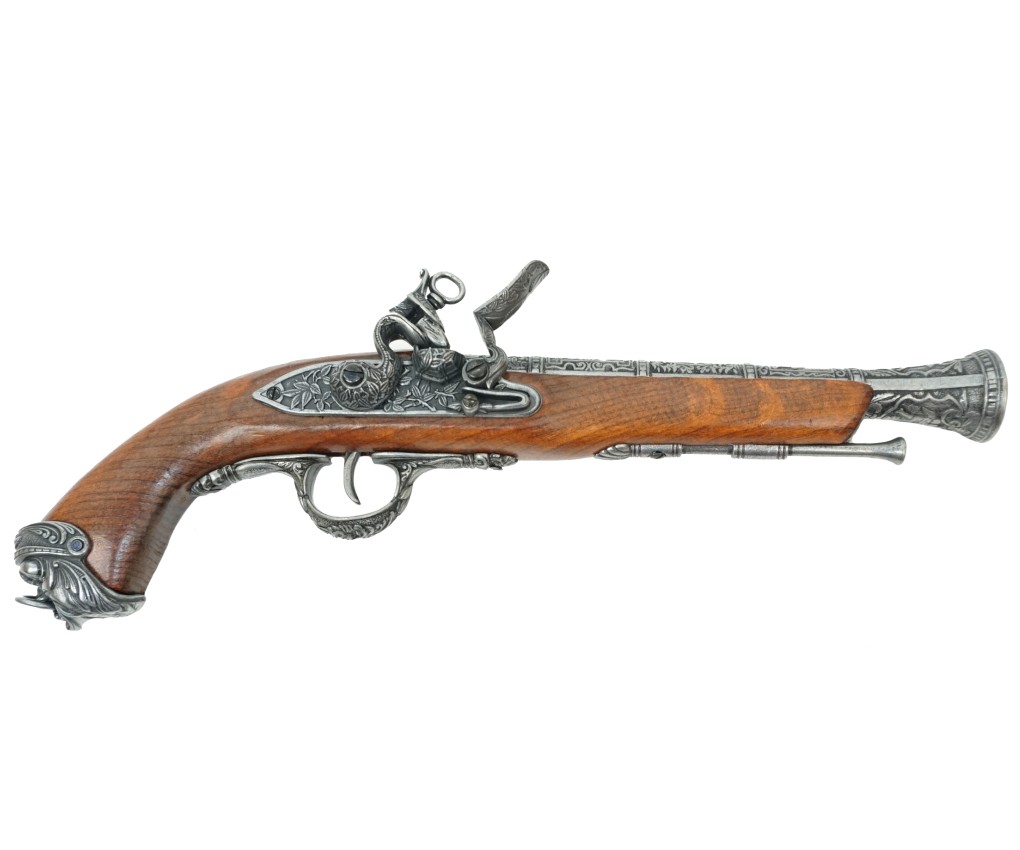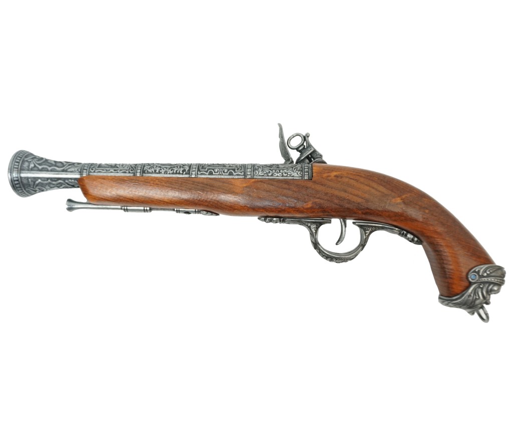 Макет итальянский пистолет – это прекрасная копия красивого оружия, использовавшегося на протяжении 15-18 веков. Пистоли, как их чаще называли в Италии, выпускались как для самообороны, так и в качестве дуэльного оружия. Золотой век пиратства пришелся на первую треть 18 столетия, и укороченные капсюльные пистолеты активно использовались этими морскими искателями приключений и легкой наживы.