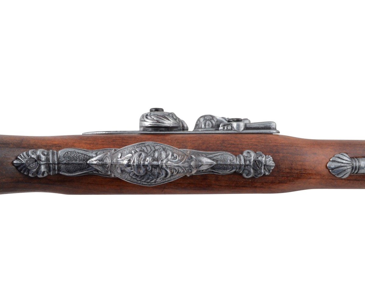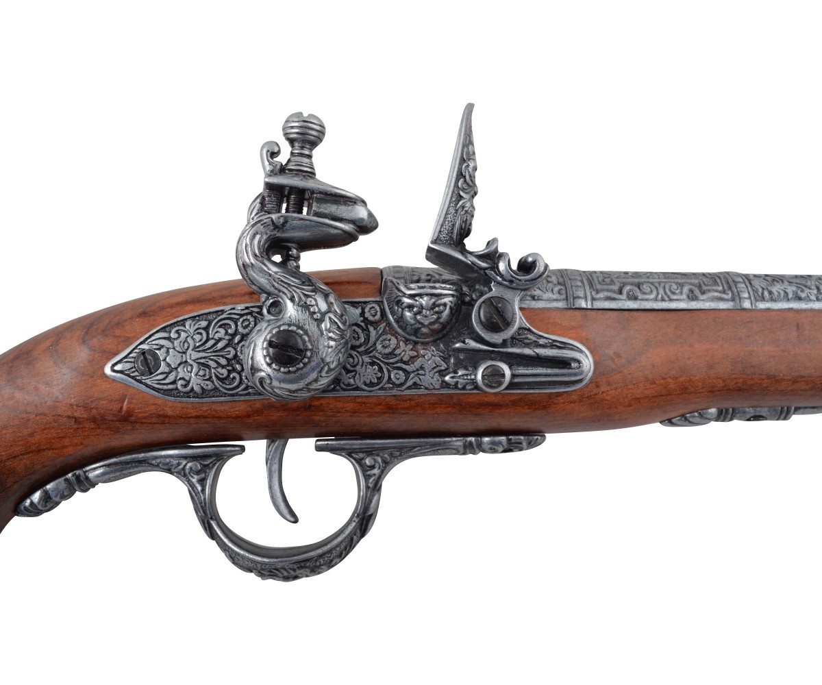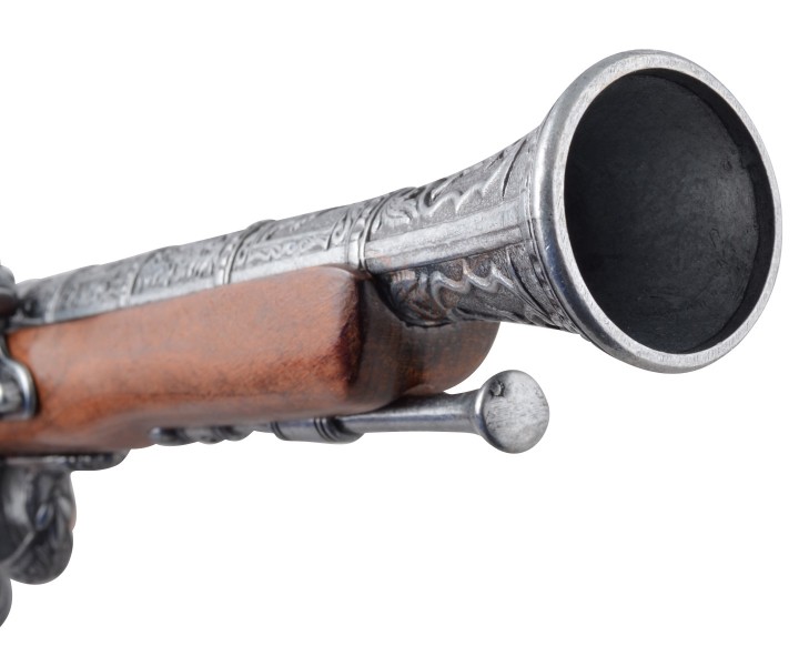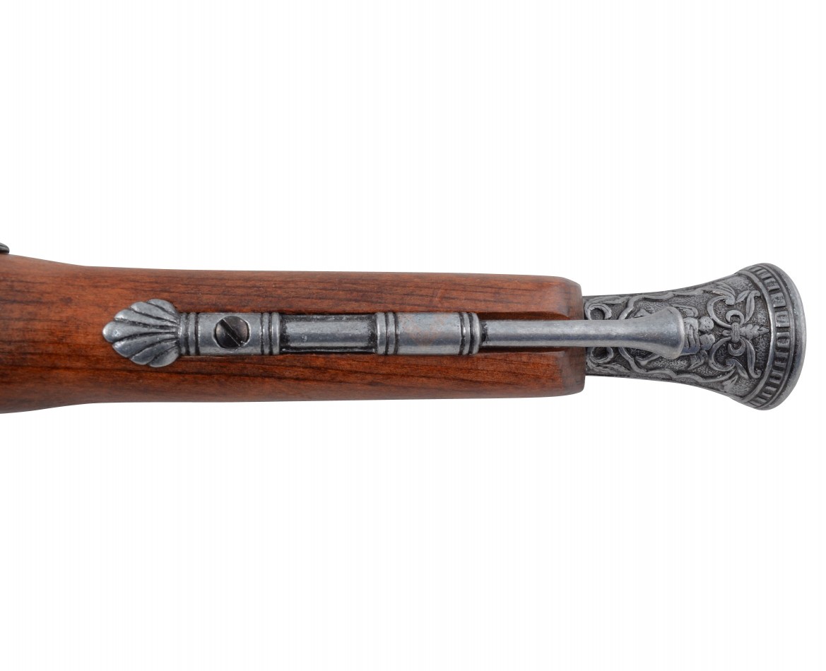 Макет итальянский пистолет – это прекрасная копия красивого оружия, использовавшегося на протяжении 15-18 веков. Пистоли, как их чаще называли в Италии, выпускались как для самообороны, так и в качестве дуэльного оружия. Золотой век пиратства пришелся на первую треть 18 столетия, и укороченные капсюльные пистолеты активно использовались этими морскими искателями приключений и легкой наживы.