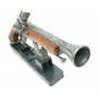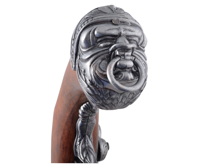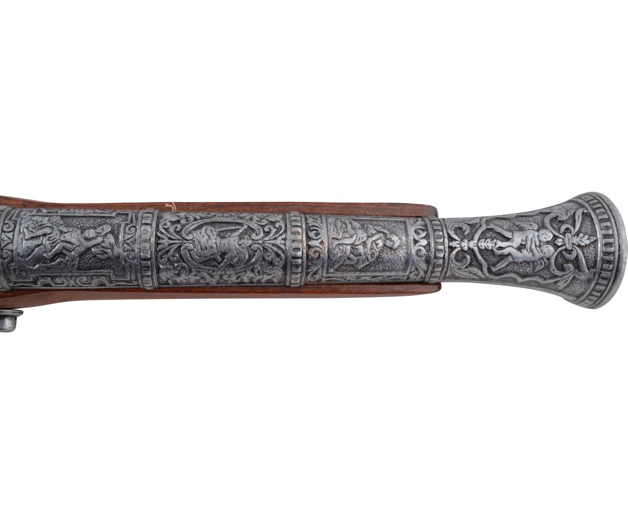 Итальянский пистолет от мастеров сувенирных экземпляров исторического оружия, выглядит чрезвычайно эффектно. Внешний вид такого образца ничем не отличается от оружия, распространенного в 15-18 веках. Для изготовления пистолета использован zamak – сплав на основе алюминия и цинка, а также сталь. Рукоятка и ложе изготовлены из натурального дерева и украшены имитацией гравировки. Ствол пистолета имеет расширенную в сторону дула форму, под столом – имитация шомпола, необходимого для регулярной чистки оружия и его зарядки. Рукоять украшает устрашающая маска с кольцом, которое, видимо, предназначалось для закрепления оружия на поясном ремне. Габариты и вес пистолета отвечают оригинальным образцам того времени: вес оружия – 0,69 кг, длина – 39 см. Ударный механизм и спусковой крючок подвижны, это делает пистолет еще более аутентичным.