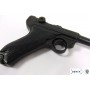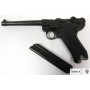 Макет пистолет Люгер Парабеллум P08 от испанской компании Denix отличается хорошим качеством исполнения и внешне максимально схожа на боевой прототип. Есть возможность передергивать затвор, спускать курок или вынуть обойму. Размеры, конфигурация и вес макета соответствуют оригиналу. Для производства этого экземпляра использован качественный сплав на основе цинка и пластик для рукоятки, со стилизацией под дерево.