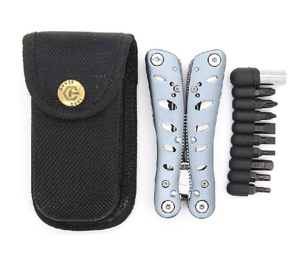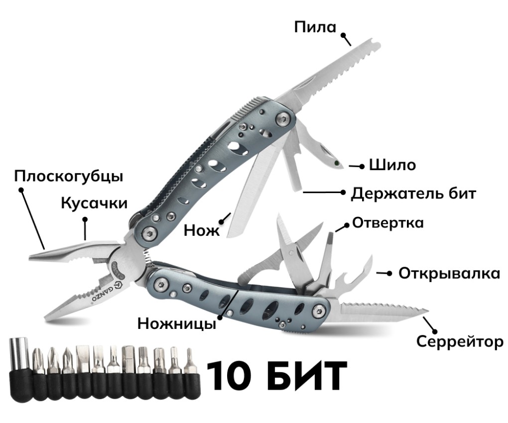 Инструменты: | плоскогубцы с кусачками, нож с прямой заточкой, нож с серрейторной заточкой, пила, плоская отвертка, крестовая отвертка, ножницы, шило, инструмент для снятия изоляции с проводов, открывалка, консервный нож, держатель для бит, набор бит с переходником |