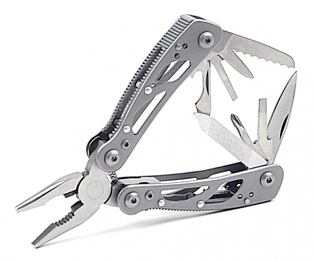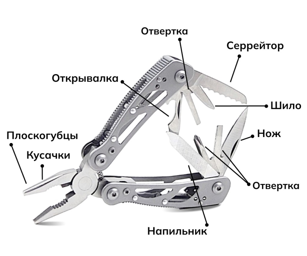 Инструменты: | плоскогубцы с кусачками, лезвие с прямой заточкой, серрейтор, две плоских отвертки разного размера, крестовая отвертка, шило, напильник, открывалка |