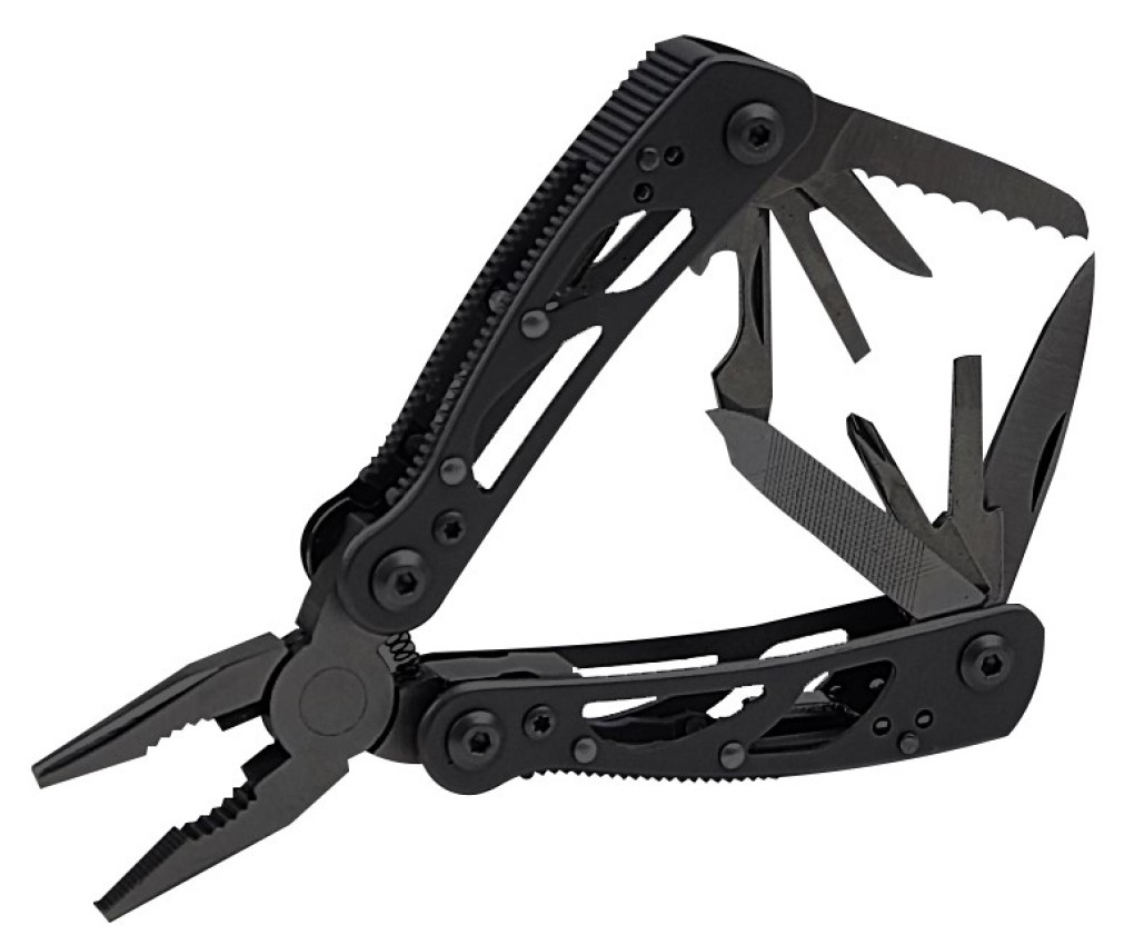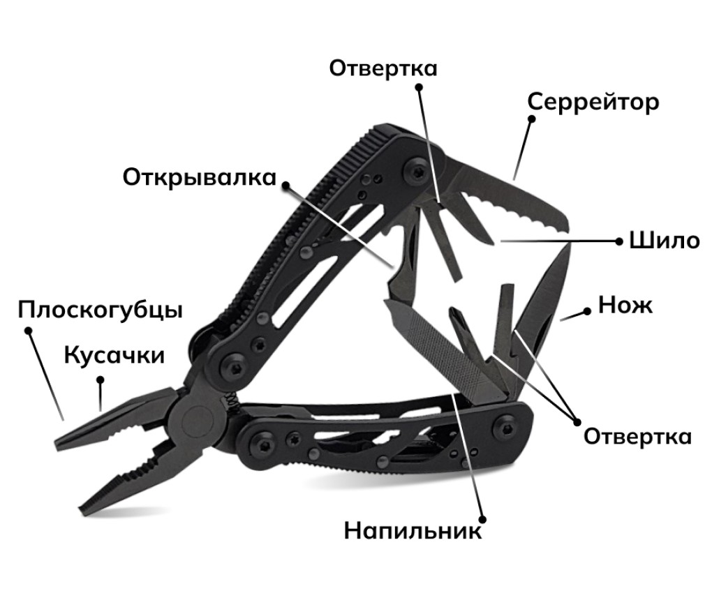 Инструменты: | плоскогубцы с кусачками, лезвие с прямой заточкой, серрейтор, две плоских отвертки разного размера, крестовая отвертка, шило, напильник, открывалка |
