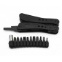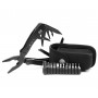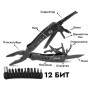 Центральный элемент мультитула — подпружиненные плоскогубцы. Они автоматически возвращаются в исходное положение после сжатия, что упрощает использование и снижает усталость рук при долгой работе с инструментом. Плоскогубцы отлично справляются с удерживанием мелких деталей, перекусыванием проволоки и монтажом крепежных элементов. В набор бит входят 5 шестигранников, 3 плоских отвертки и 3 крестовых. Насадки крепятся к держателю с помощью магнитного переходника. Биты не болтаются и не выпадают во время работы.