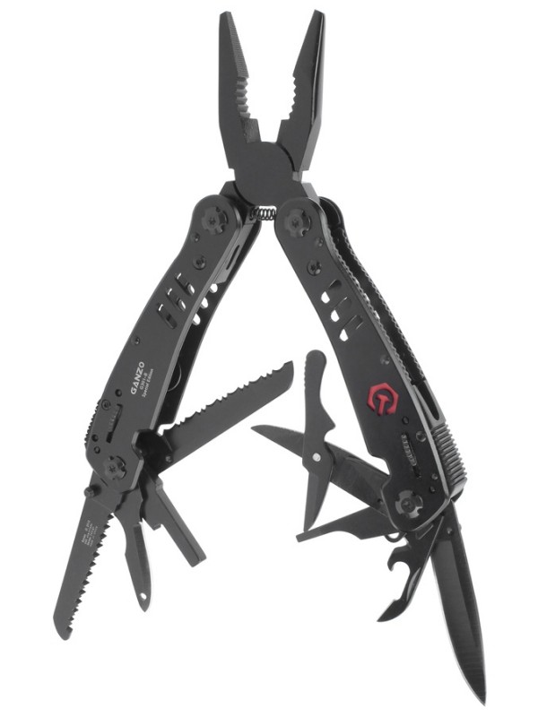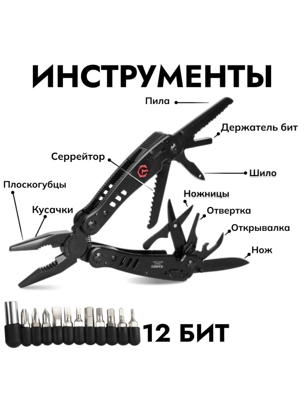 Инструменты: | плоскогубцы с кусачками, плоская отвертка, нож с серрейторной заточкой, нож с прямой заточкой, консервный нож, открывалка для бутылок, инструмент для снятия изоляции, ножницы, шило, кольцо для крепления шнурка, пила, держатель для бит |