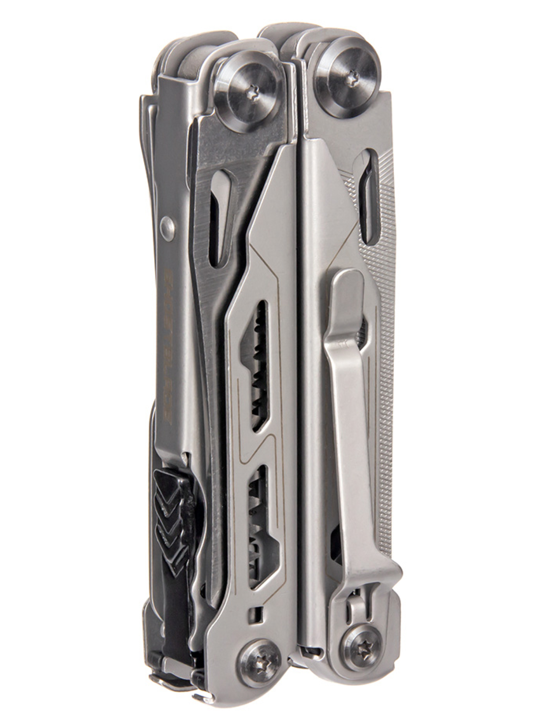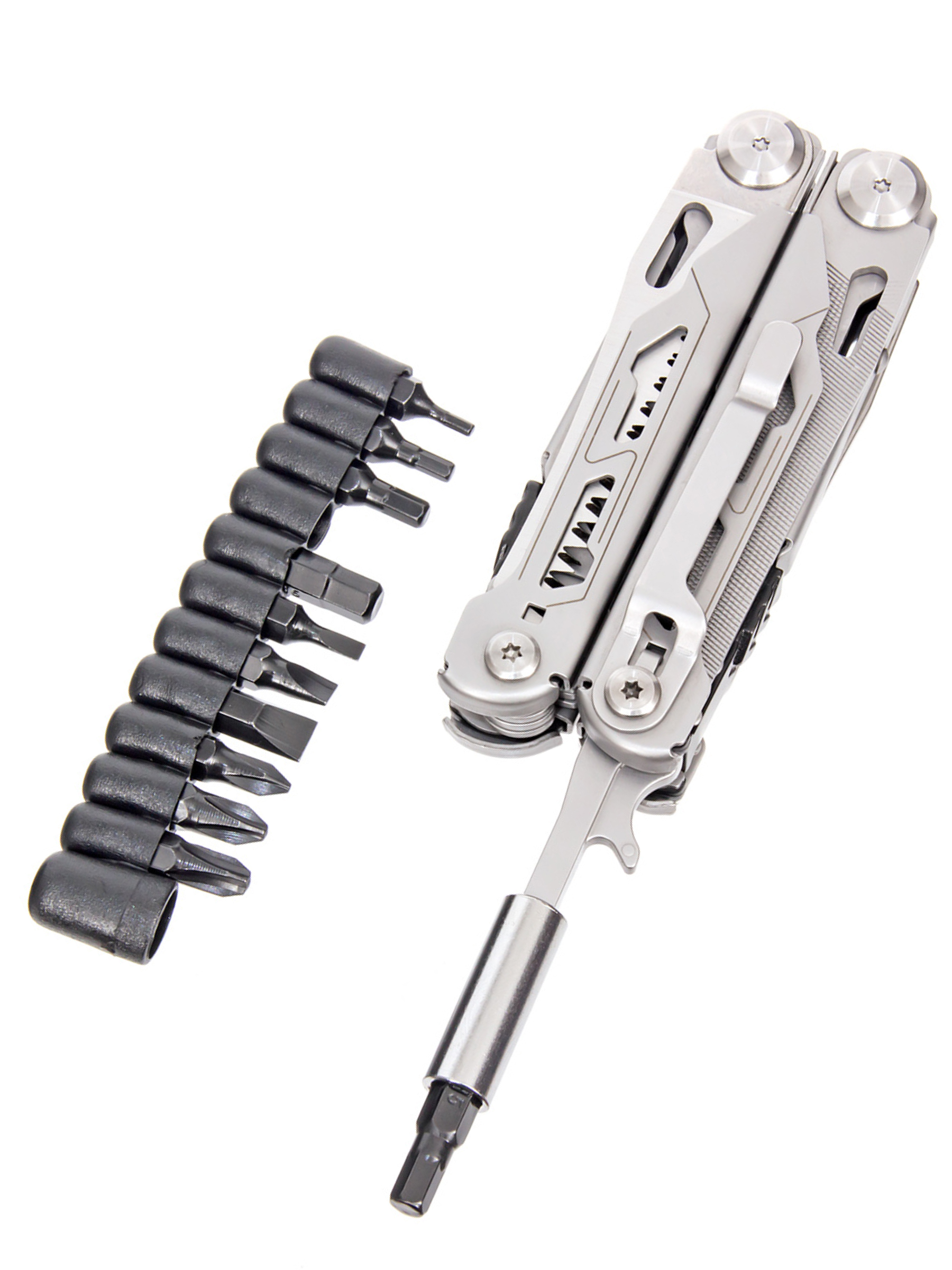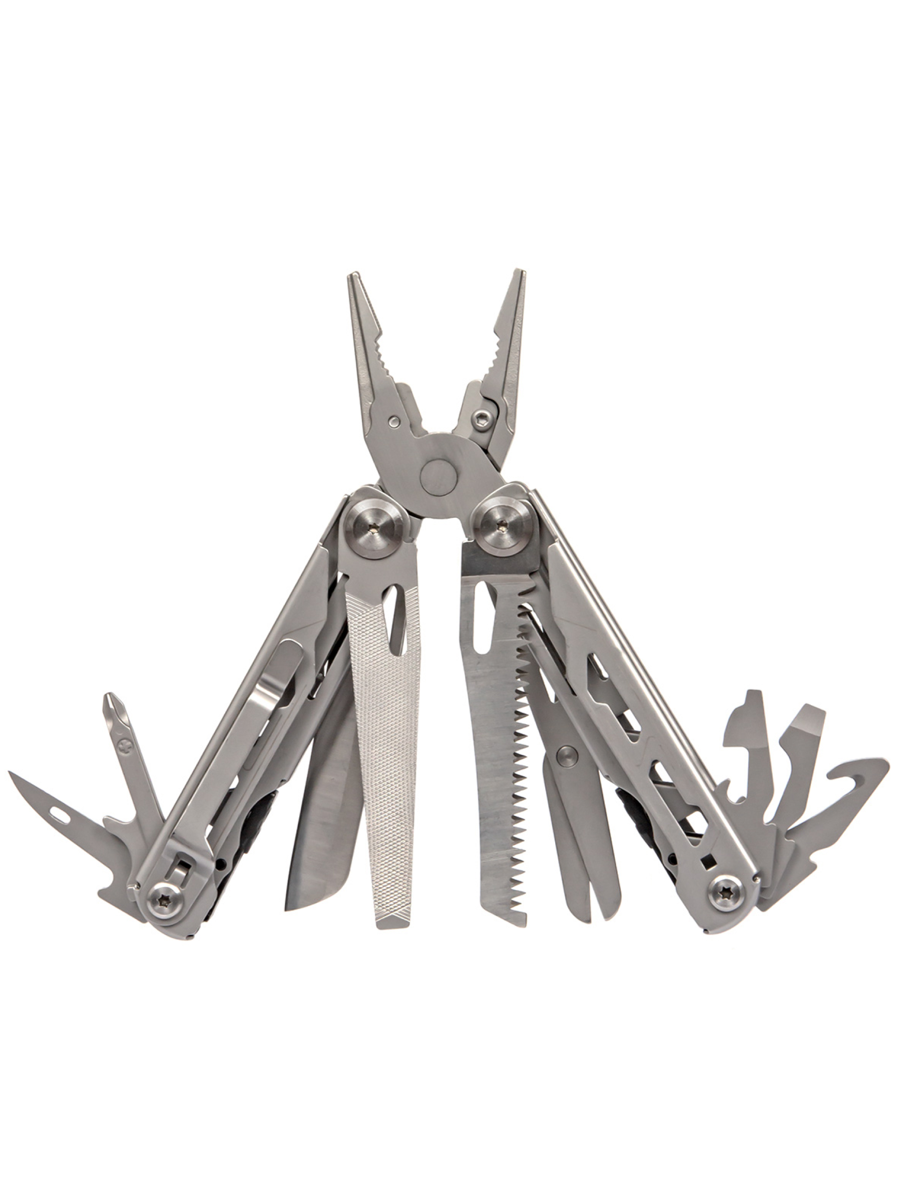 | Инструменты: | плоскогубцы, пассатижи, кусачки со сменными губками, стропорез, открывалка для бутылок, отвертка с плоским шлицем шириной 5 мм, отвертка с плоским шлицем шириной 3 мм, отвертка с плоским шлицем шириной 7 мм, открывалка для консервов, ножницы, пила по дереву, основной клинок, клипса для ношения, крестовая отвёртка Philips / основание для переходника под биты, шило с ушком, напильник, линейка, инструмент для зачистки проводов |