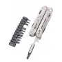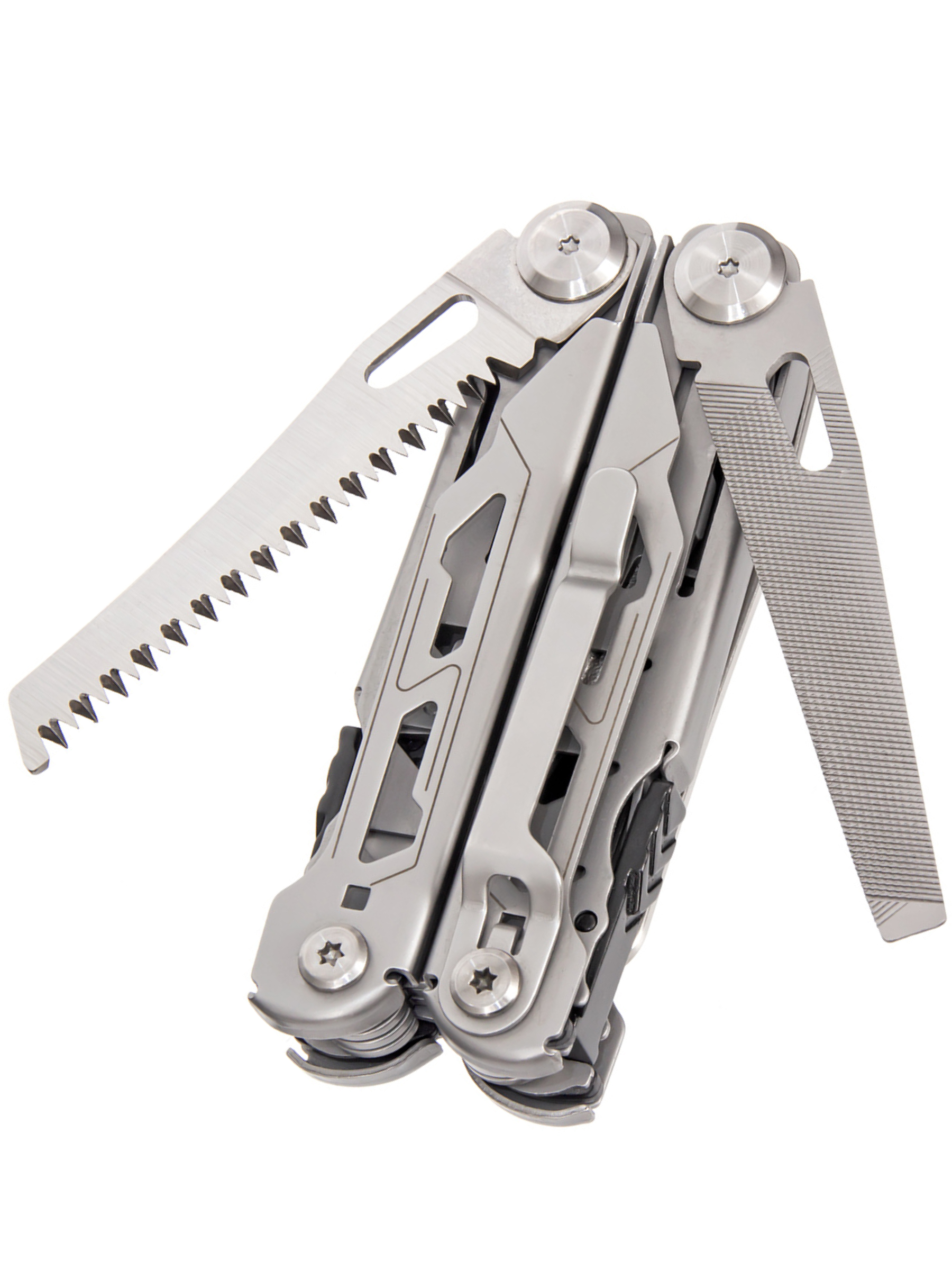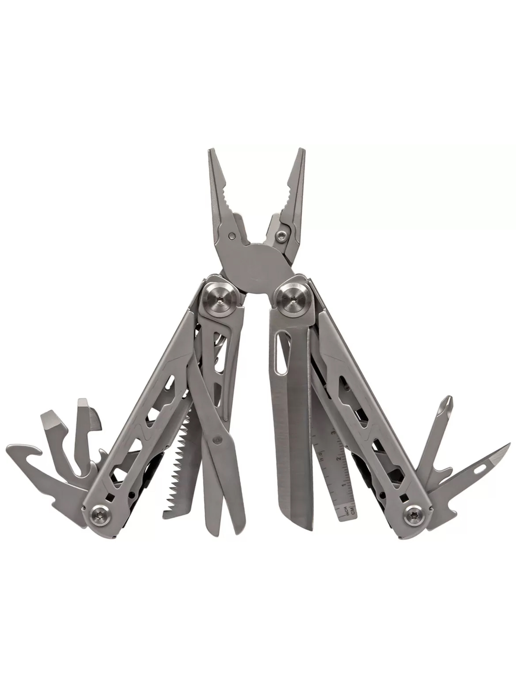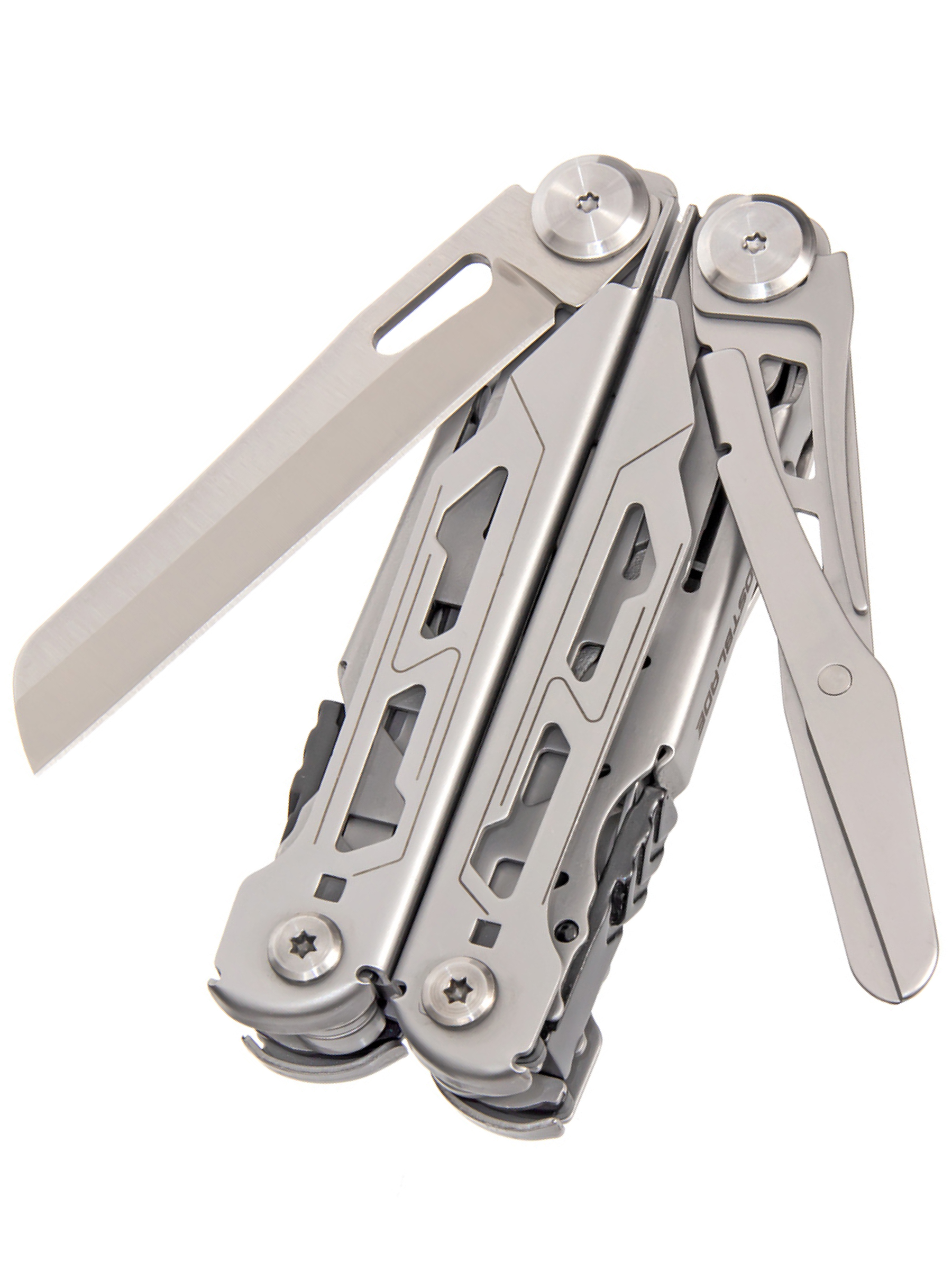 | Инструменты: | плоскогубцы, пассатижи, кусачки со сменными губками, стропорез, открывалка для бутылок, отвертка с плоским шлицем шириной 5 мм, отвертка с плоским шлицем шириной 3 мм, отвертка с плоским шлицем шириной 7 мм, открывалка для консервов, ножницы, пила по дереву, основной клинок, клипса для ношения, крестовая отвёртка Philips / основание для переходника под биты, шило с ушком, напильник, линейка, инструмент для зачистки проводов |