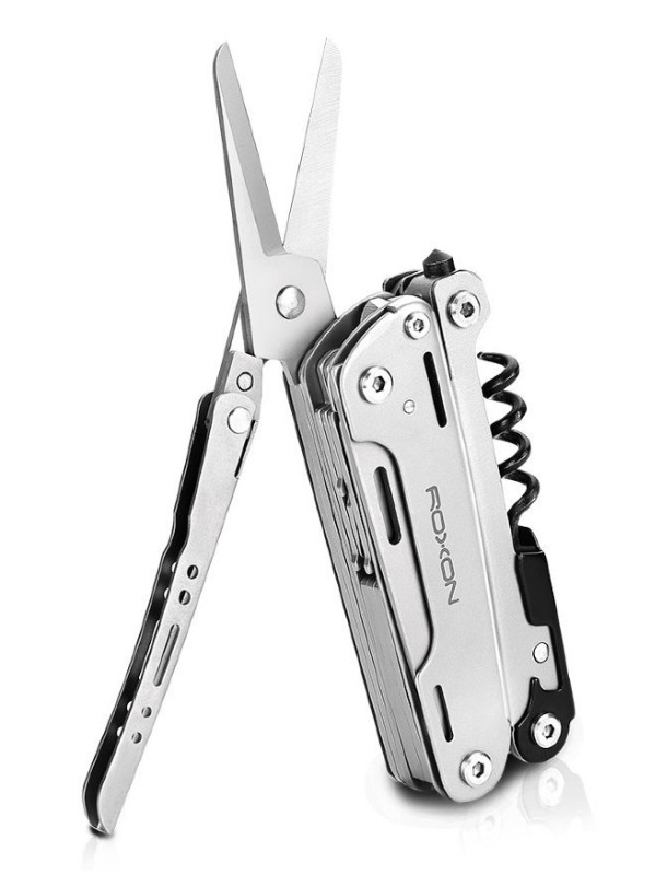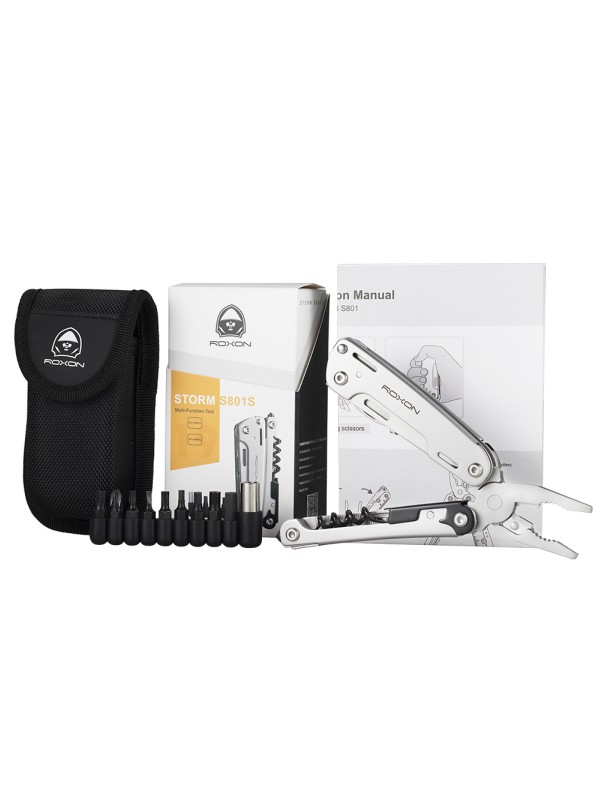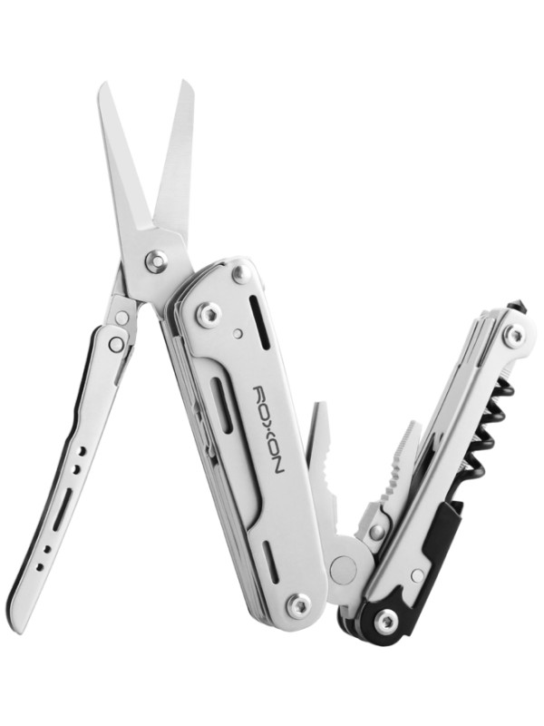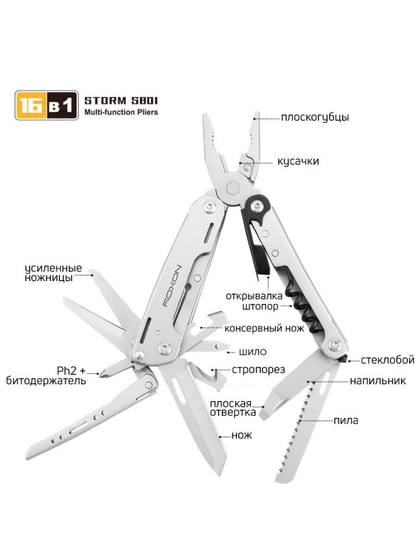 Модель Roxon STORM S801S создана по принципу классических мультитулов. Роль главного инструмента в нем выполняют плоскогубцы. Они дополнительно оснащены захватом для круглых предметов и функцией кусачек. Все остальные инструменты размещаются внутри двух металлических рукояток.