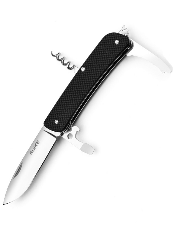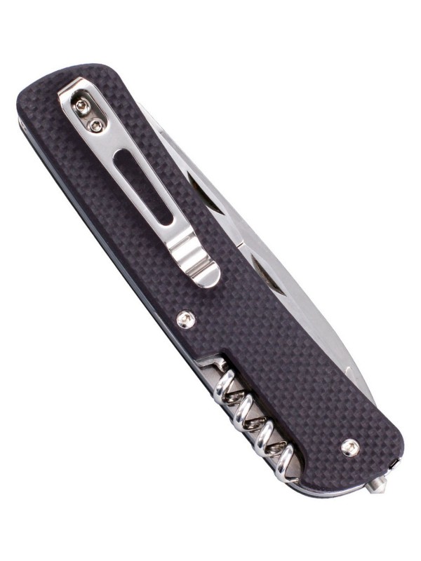 Среди инструментов в данном ноже, помимо основного клинка, выполненного в форме Drop-point с прямой заточкой, вы также сможете найти небольшое лезвие с серрейторной (волнообразной) заточкой, отвертку с плоским шлицем, комбинированную с открывалкой, штопор, а также откидное ушко темляка. А в одной из пластин рукояти «прячутся» съемные щипцы.