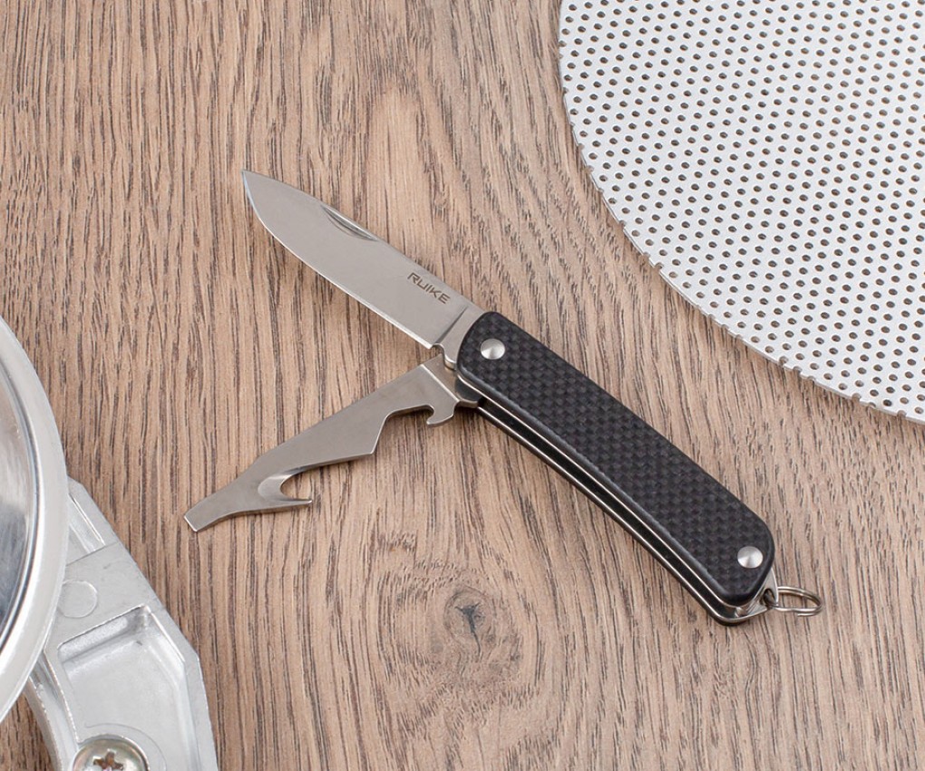 Рядом с клинком ножа в рукоятке размещается еще одна стальная пластина. В ней объединены сразу несколько дополнительных инструментов, которыми производители оснастили модель Ruike S21. На внешнем краю этой пластины сделана прямая отвертка, ширина шлица которой составляет 4 мм. Около нее размещен стропорез, а еще ближе к рукоятке – открывалка для бутылок.