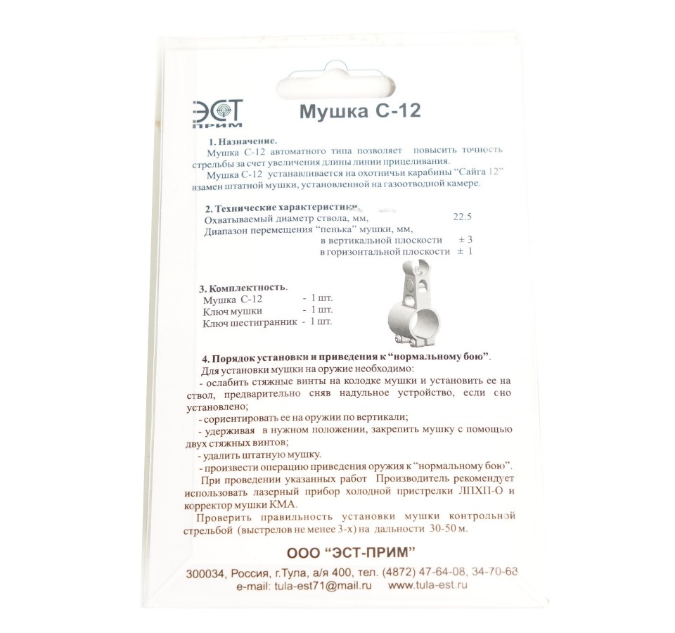 Мушка С-12 автоматного типа позволяет повысить точность стрельбы за счет увеличения длины линии прицеливания. Мушка С-12 устанавливается на охотничьи карабины «Сайга 12» взамен штатной мушки, установленной на газоотводной камере.