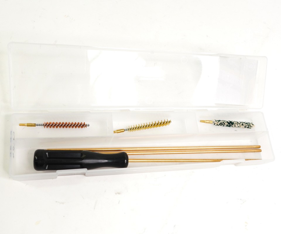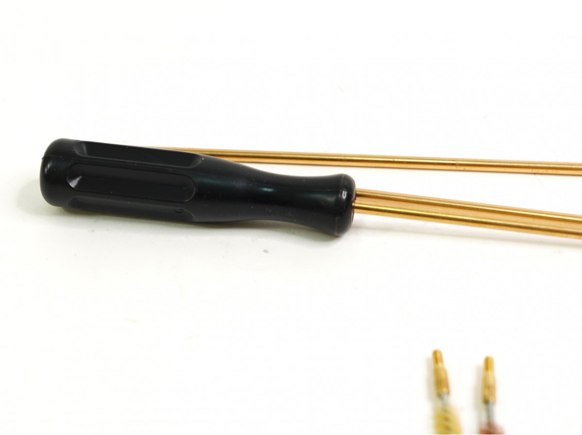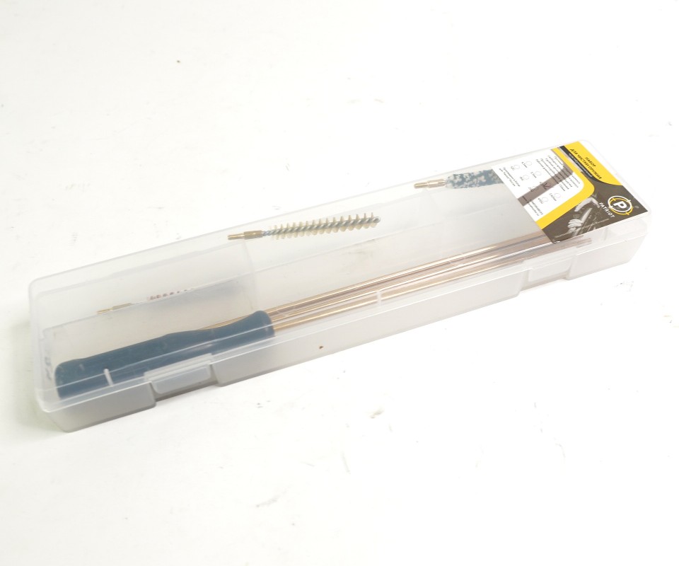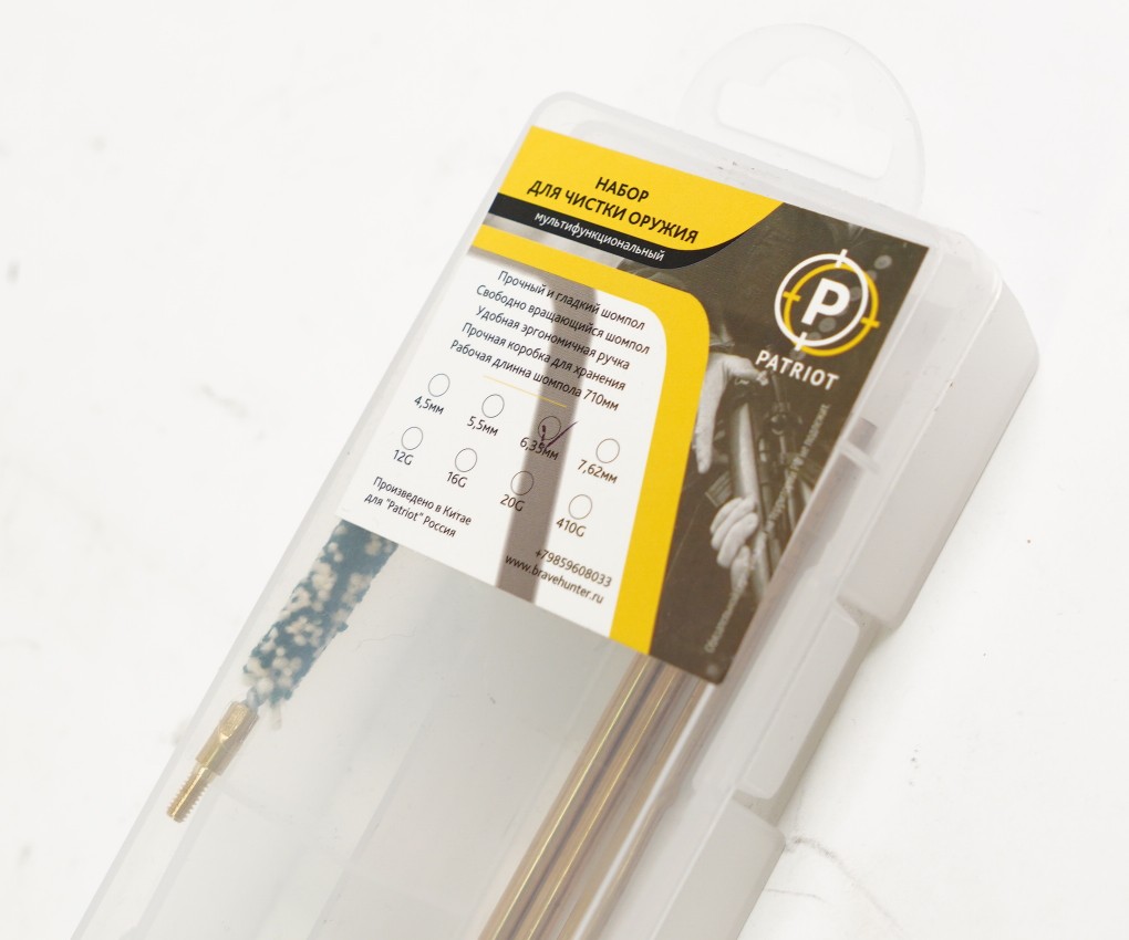 Набор для чистки ствола Patriot калибра 6,35 мм, в пластиковом футляре (BH-CK24) предназначается для чистки пневматического оружия. Латунный шомпол со свободно прокручивающейся пластиковой рукоятью собирается из трех стержней. Длина шомпола с насадкой составляет 87 см. В комплект входят три ерша с метрической резьбой М3х0,5: латунный, щетка и пуховик. Набор для чистки Patriot упакован в прозрачный пластиковый футляр.
