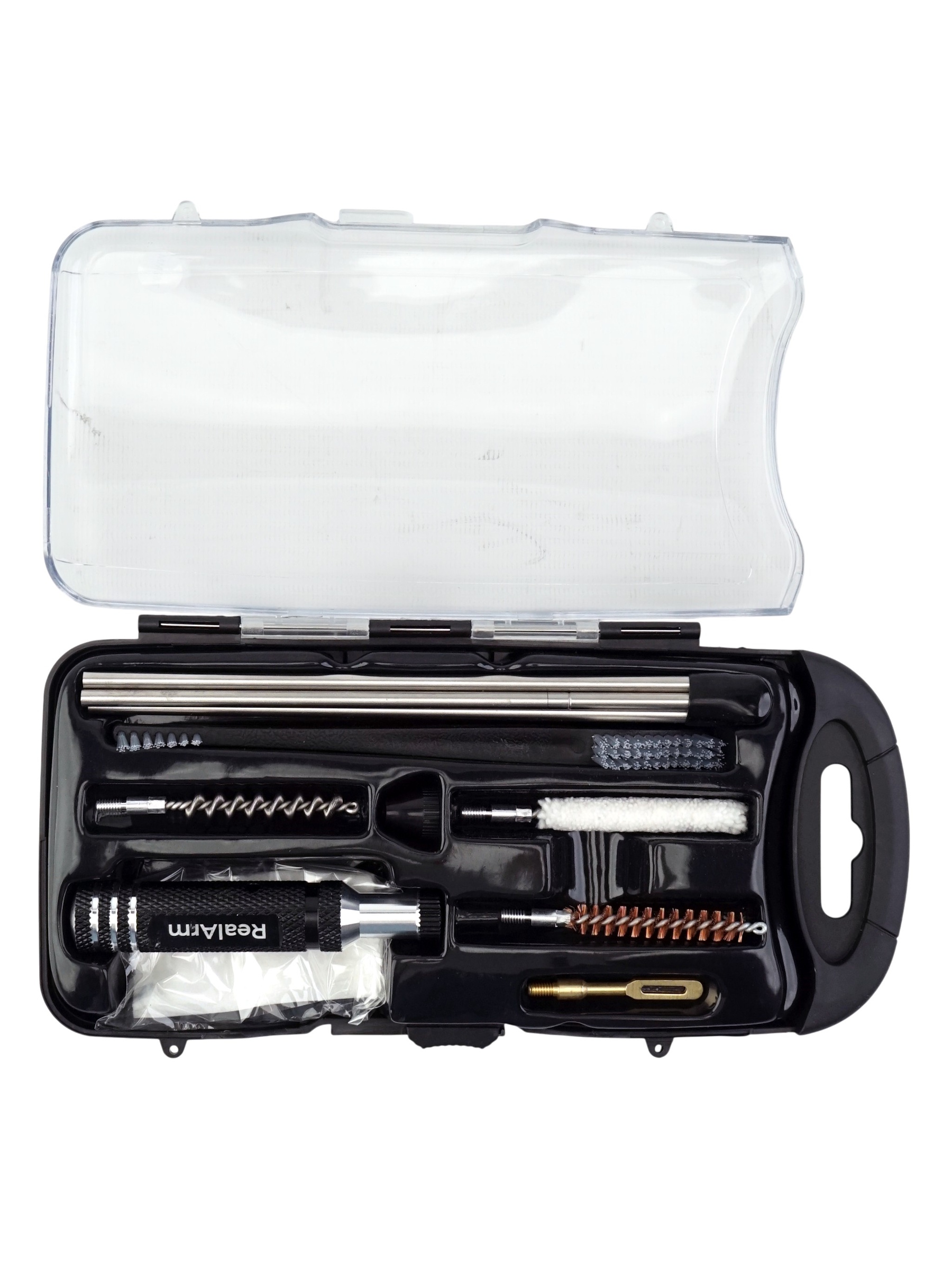 | Комплектация (?): | сборный шомпол, двусторонняя щетка, алюминиевая рукоять, хлопковая насадка, бронзовый и стальной ершик, вишер щелевой, надульный колпачек, салфетки (50 шт), пластиковый кейс | |