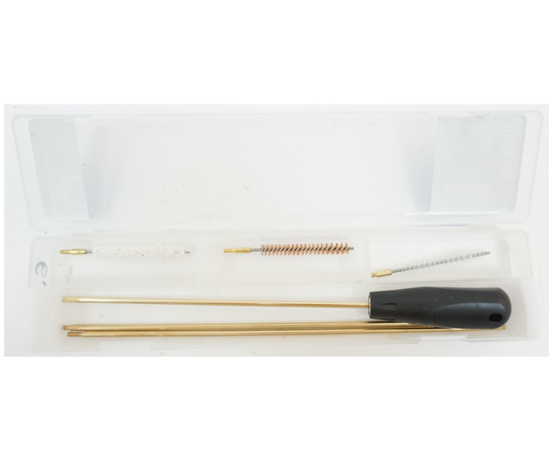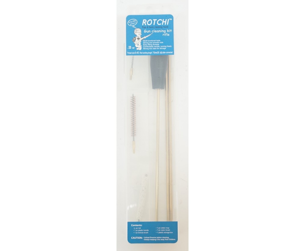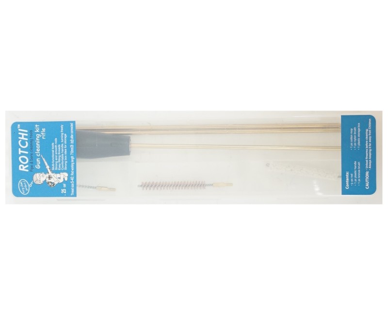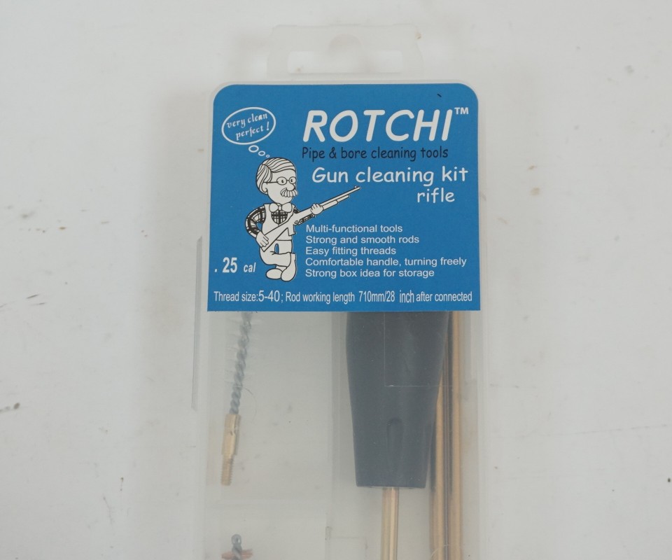 Набор для чистки ствола Rotchi калибра 6,35 мм, в пластиковом футляре (BH-CK05) предназначается для чистки пневматического оружия. Латунный шомпол со свободно прокручивающейся пластиковой рукоятью собирается из трех стержней. Длина шомпола с насадкой составляет 87 см. В комплект входят три ерша с метрической резьбой М3х0,5: латунный, щетка и пуховик. Набор для чистки Rotchi упакован в прозрачный пластиковый футляр.