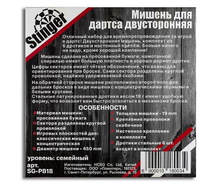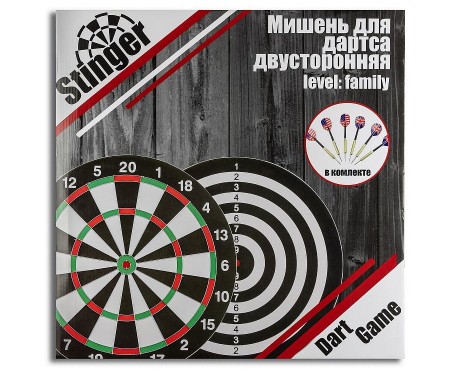 Комплектация (?): | мишень двухсторонняя, 6 дротиков (18 г) |