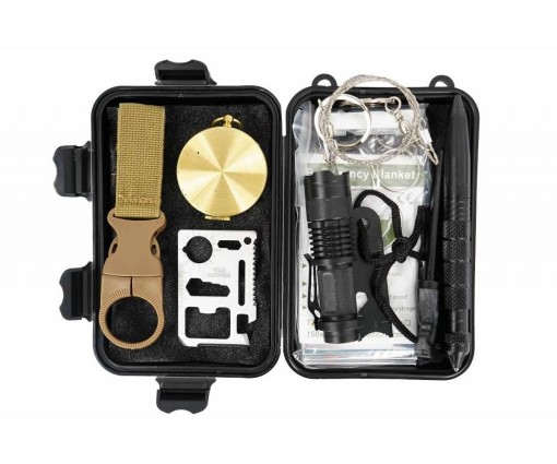 Тактический туристический набор для выживания в экстремальных условиях, в лесу, походе, на рыбалке или охоте состоит из 12 предметов. Такие наборы также именуют армейскими или военными, так как их оснащение отвечает и потребностям сотрудников силовых структур.