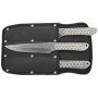 Вес каждого ножа довольно большой – 0,22 кг. Длина клинка 16 см, общая длина ножа 28 см. Рукоять украшена геометрическим рисунком. Так как ножи для метания не являются холодным оружием, в России они разрешены для свободной продажи. Поставляются с чехлом из кордуры, для каждого ножа этого набора предусмотрен свой карман.