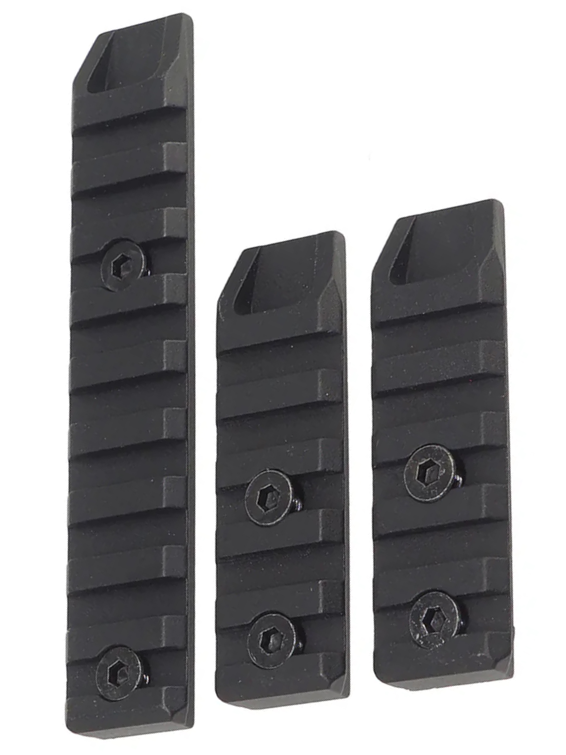 Ширина каждой планки — 20 мм, а вес всего комплекта, включающего три планки и болты для крепления, составляет 190 г, что делает их легкими и практически незаметными при использовании. Благодаря надежному креплению на цевье с системой M-LOK, эти планки обеспечивают стабильность и прочность фиксации, позволяя устанавливать различные аксессуары — тактические фонари, лазеры, ручки и другие дополнения.