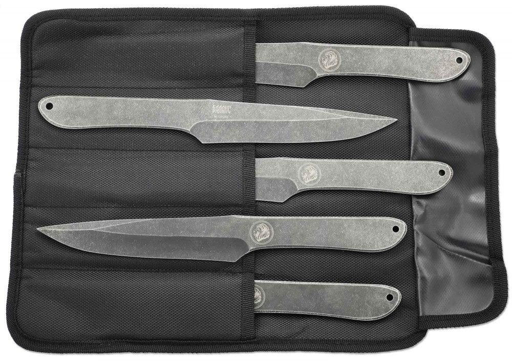 Набор из 5 метательных ножей (M-122LBS) – это комплект цельнометаллических спортивных изделий, упакованные в удобный мягкий чехол. Каждый из клинков имеет твердость 55-56 Hrc, толщина обуха составляет 5 мм. Материал – среднелегированная сталь марки 40Х13, за счет такого материала ножи способны выдерживать многочисленные удары по мишени и при этом сохранять свой внешний вид и свойства.