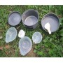 Набор из анодированного алюминия на 2 персоны. В комплекте: котелок с крышкой, сковорода, 2 пластиковые тарелки, черпак, деревянная лопатка, мочалка, чехол.