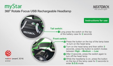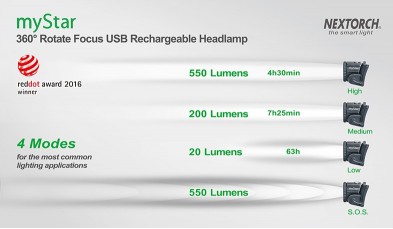 My Star - это регулируемый, перезаряжаемый фонарь, с 360-градусной регулировкой мощности луча. Так что вы сможете свободно настраивать фокусировку луча на соответствующий, в зависимости от требований освещения. Легкий многорежимный светодиодный фонарь с максимальным выходом мощности 550 люмен. Оснащен запатентованной технологией фокусировки линз Fresnel Technology NEXTORC. Батарейный отсек распологается на затылочной части головы и не мешает при движении. Нажатием на кнопку можно включить и выключить фонарь, а так же менять режимы работы. При работе фонаря влючается световой индекатор, который расположен на баторейном отсеке. Эластичный головной ремень удобный и легко регулируется. Ремешок сделан из материала, который представляет собой смесь высококачественного нейлона и резины, что делает его воздухопроницаемым («дышащим»).