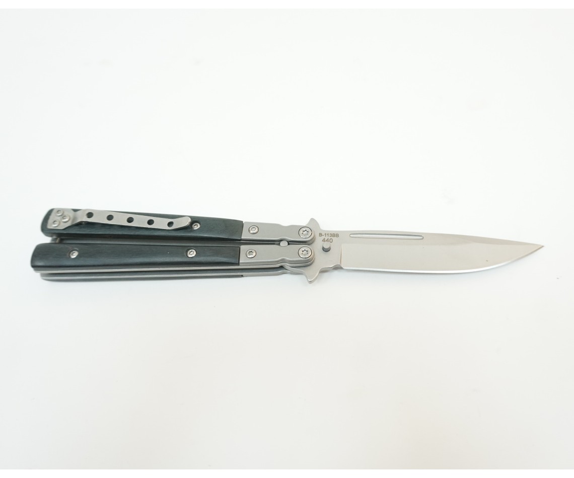 Клинок изготовлен из ножевой стали 440, содержащей в составе хром и молибден. Эти элементы способствуют долговечности сплава и его устойчивости к коррозии. Все подвижные элементы балисонга B-113BB закреплены болтами, которые можно подтянуть в случае необходимости. На задней части верхней рукояти расположена клипса для крепления на пояс, которую можно снять для восстановления баланса.