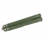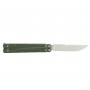 Рукоять ножа разделена надвое, что является характерной чертой балисонгов. Данная особенность позволяет быстро открыть нож одним взмахом руки, а также выполнять с его помощью различные трюки. Обе половины рукояти оснащены противоскользящими накладками из стеклотекстолита G10. Это распространенный среди ножей Ganzo материал, который превосходит обычный пластик в своей ударопрочности и может использоваться в любой среде вне зависимости от температуры воздуха. G10 легко окрашивается и надолго сохраняет яркий цвет, в том числе при воздействии ультрафиолетового освещения, нетребователен к уходу и стойко выдерживает влияние химических веществ.