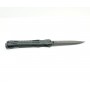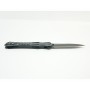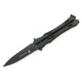 Открывается нож-бабочка МК001-2 одним движением, при котором половинки рукоятки выполняют поворот на 180º, оголяя клинок, и соединяются, образуя рукоятку. Клинок ножа кинжального типа, заточка односторонняя. Острие ярко выражено. Длина клинка 8,6 см. На поверхность клинка нанесено антибликовое покрытие черного цвета.